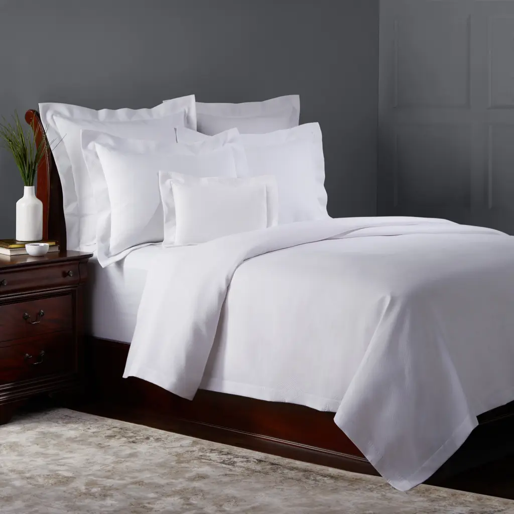 A contemporary, luxurious statement in solid hues, the coverlet and shams of the Matouk Elliot collection feature a soft, pique texture.