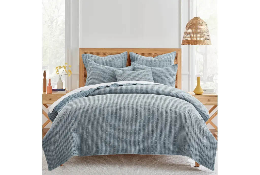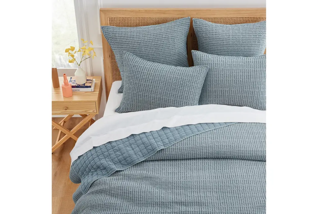 Enhance your bedroom decor with the Euro Sham-Blue Cotton Waffle Weave 2 Piece Sham Set in a soothing chambray color. Crafted from 100% cotton, these shams offer a luxurious and cozy feel, perfect for any bedding ensemble.