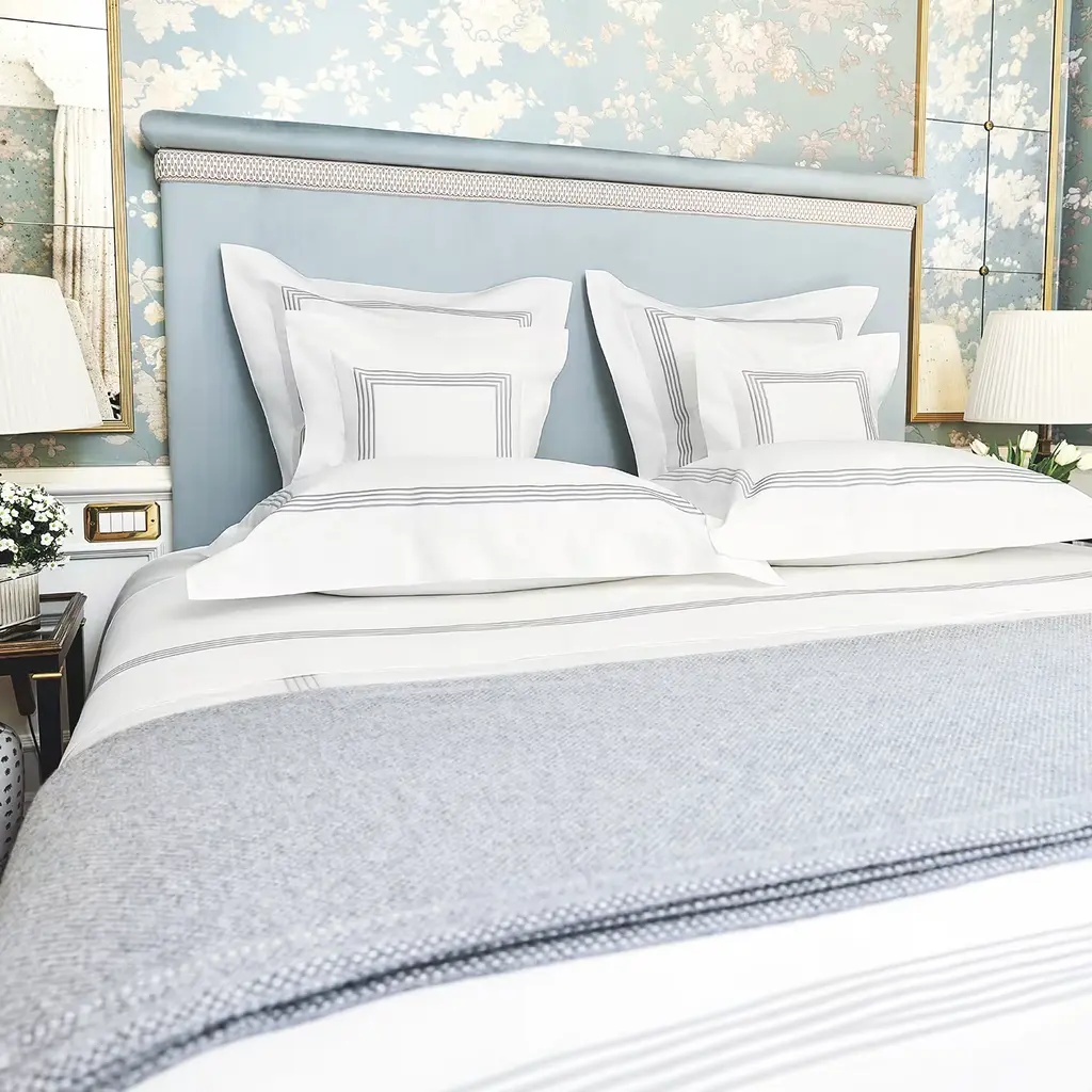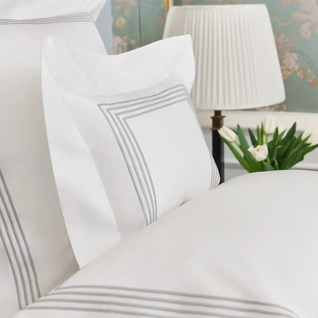 A hand-machine driven embroidery on the new Estremo percale from an exclusive selection of life’s finest things and the pride of a family tradition. "Simple lines that revolutionize an industry” A. P. Verderoccia sheets are made to dive in, sleeping is optional. Its unique threads are made of long, super-fine gauge fibers woven into a crisp yet extremely soft finished product. Made in Italy. Customizable upon request.