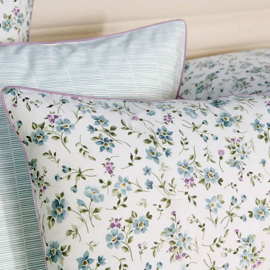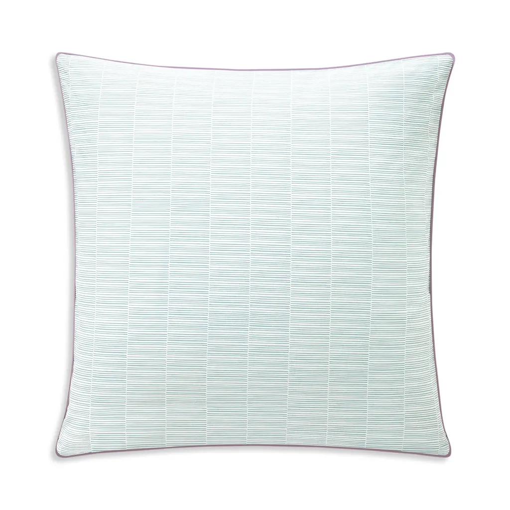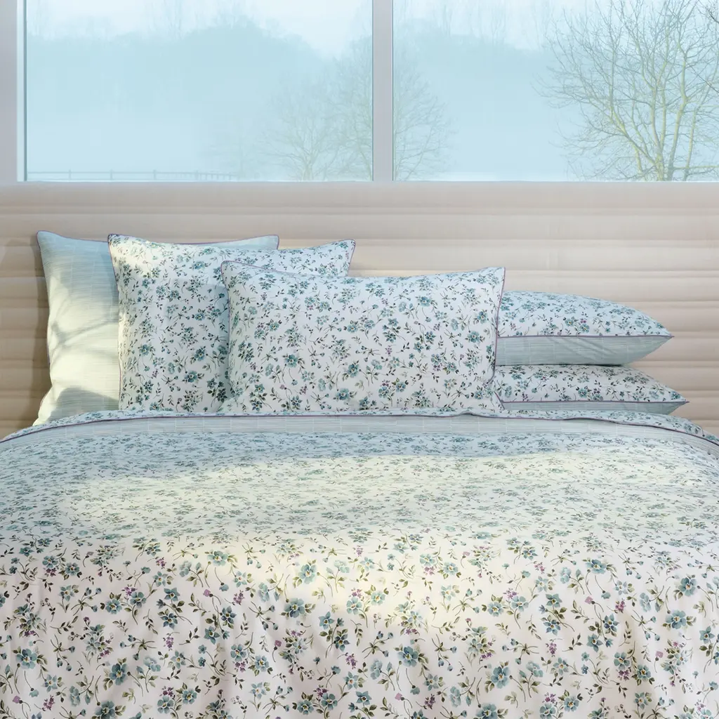 Fugace is a celebration of the senses. Flowers subtly invite themselves into this space of pure lines, forming a harmonious bridge between nature and architecture. Their delicate motifs infuse a touch of humanity and poetry, becoming a discreet accent, a delicate and perfectly mastered note. They awaken our senses, inviting contemplation and an intimate connection with the living. In Art, periwinkle flowers are said to impart a sense of calmness, spirituality, and peace, and are a symbol of love, hope, and strength. Fugace is the French word for fleeting, as in the periwinkle flowers which bloom for only a short period of time. The flowers print and the horizontal stripes print are done on a warm white ground. Fugace duvet covers and shams have the all-over periwinkle flowers print on one side and the small horizontal stripes print on the other side. Fugace flat sheets have the all-over flowers print. Fugace fitted sheets and pillowcases are in the horizontal stripes print. Fugace shams, flat sheets and shams are embellished with a lilac colored piping finishing detail. Fugace shams and pillowcases have an envelope enclosure which hides the pillow insert from view.