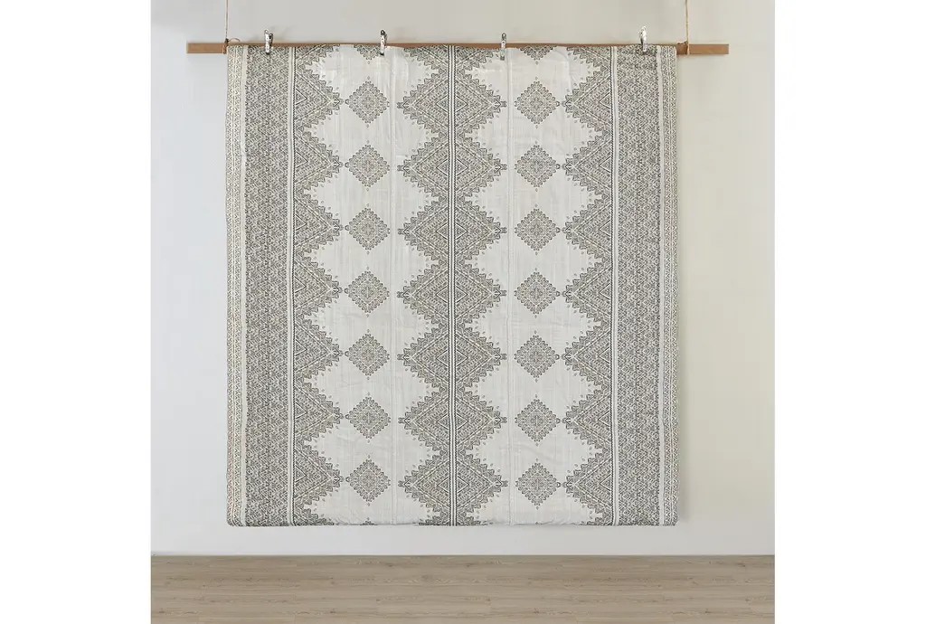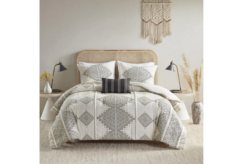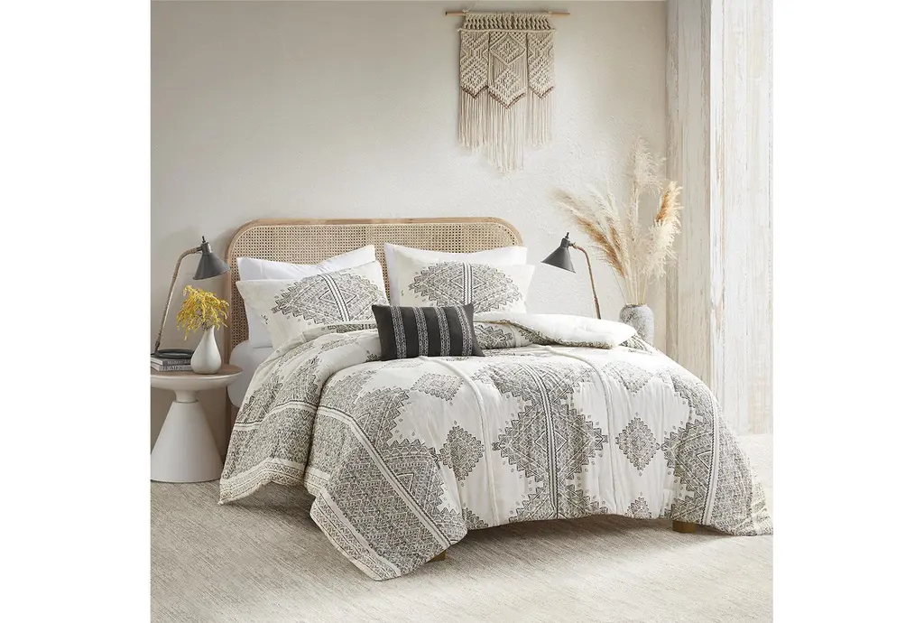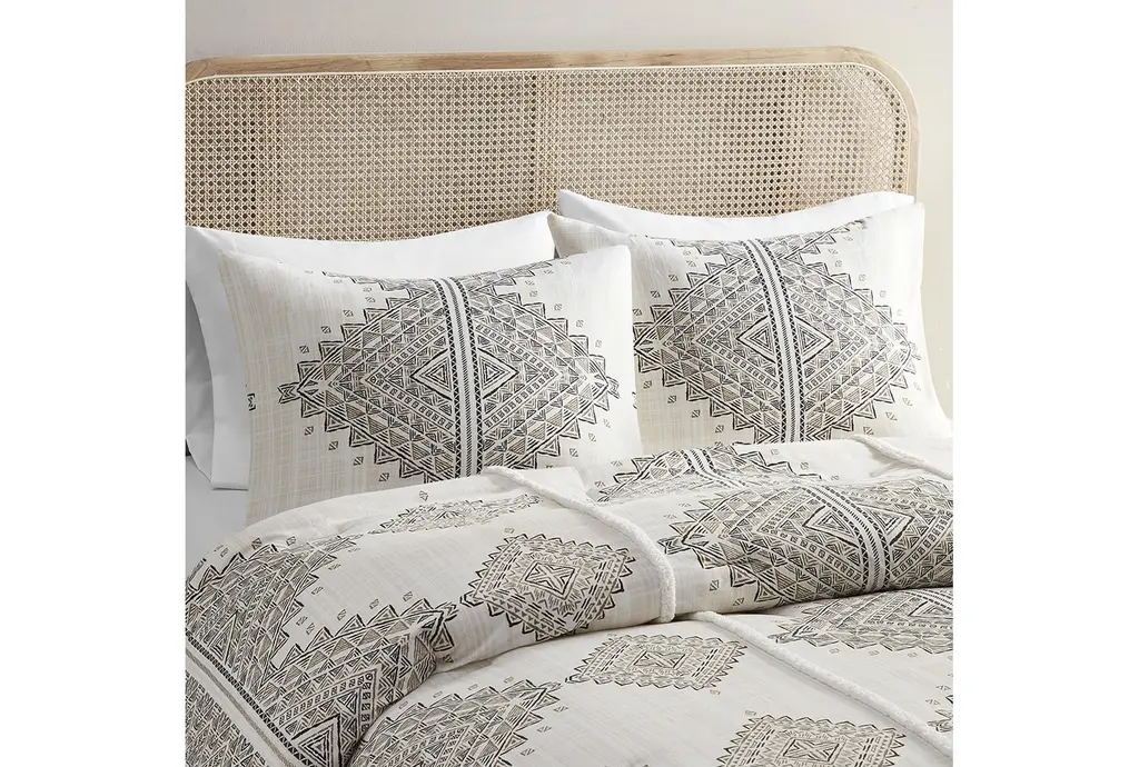 Full Queen Polyester Comforter-Black & Ivory Ibiza Printed 4 Piece Set With 1 Comforter 2 Shams & 1 Accent Pillow | Machine Washable