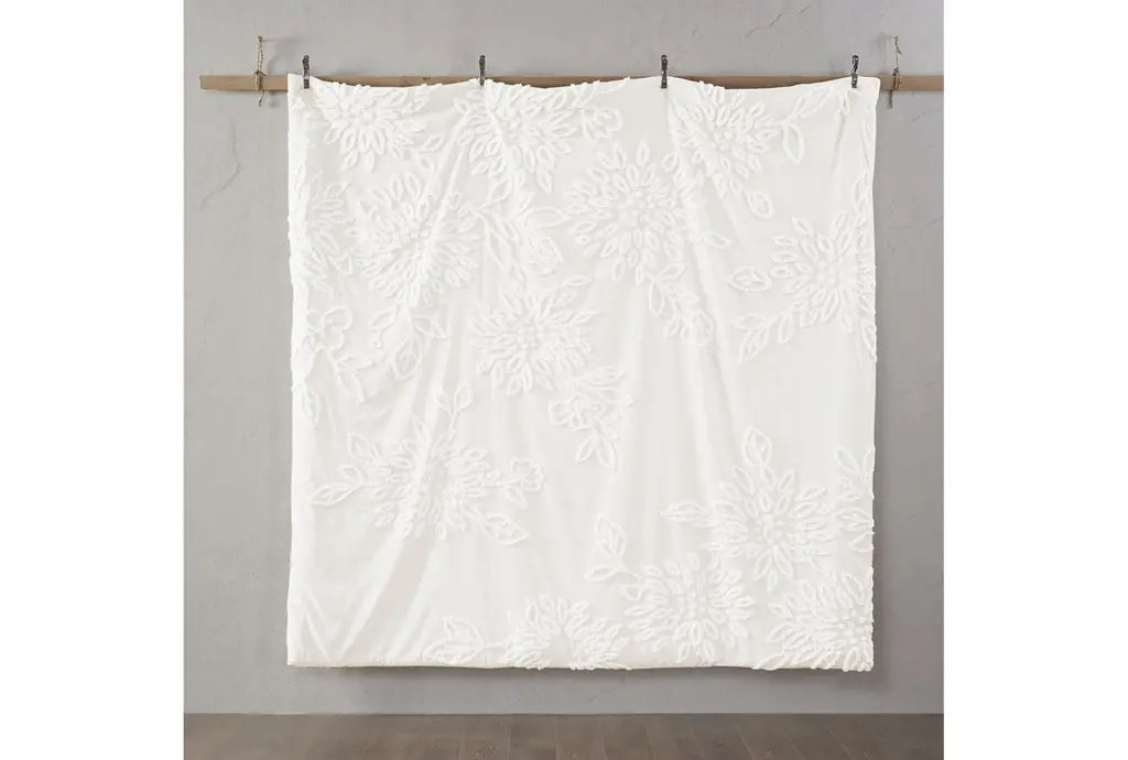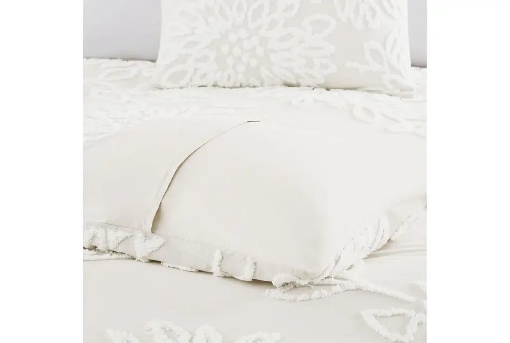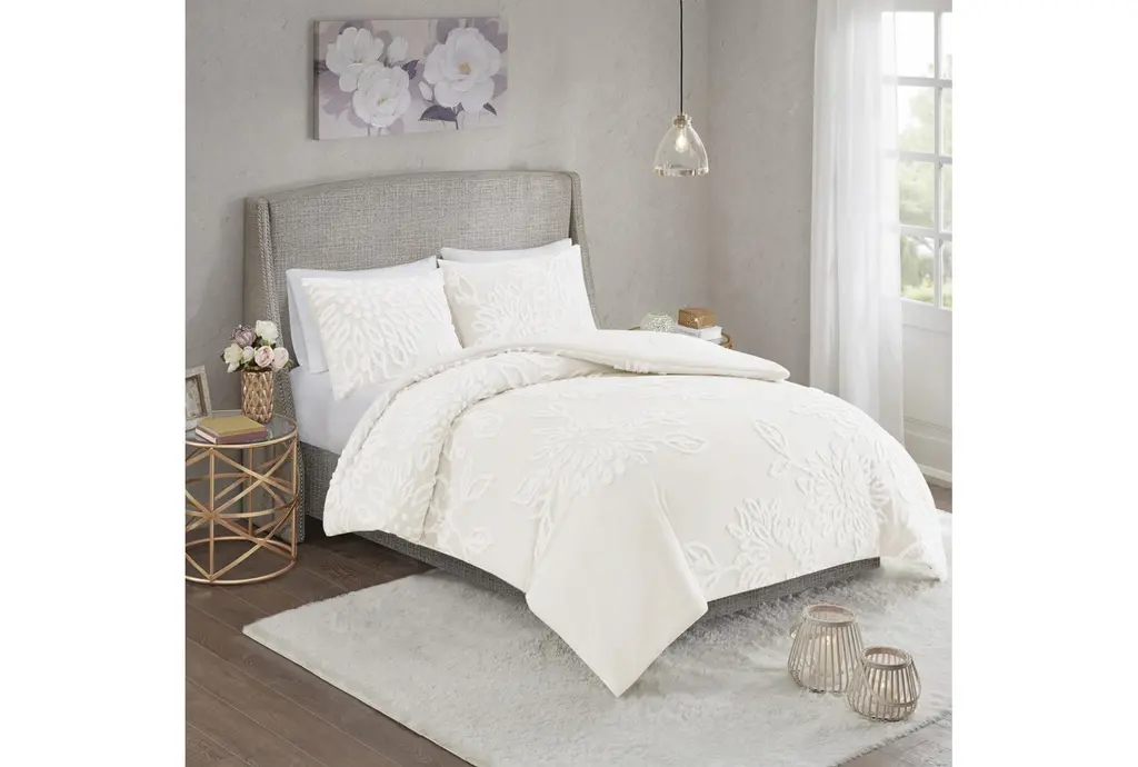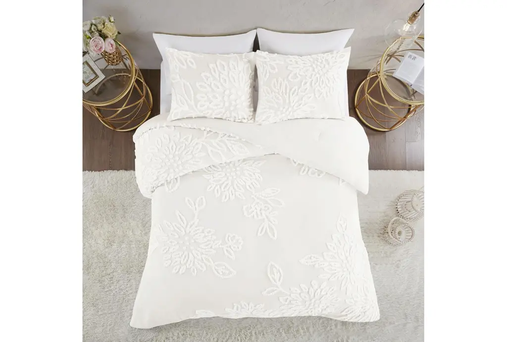 Full/queen Comforter- Ivory Veronica Tufted Cotton Chenille Floral 3 Piece Set With 1 Comforter & 2 Standard Shams | Machine Washable