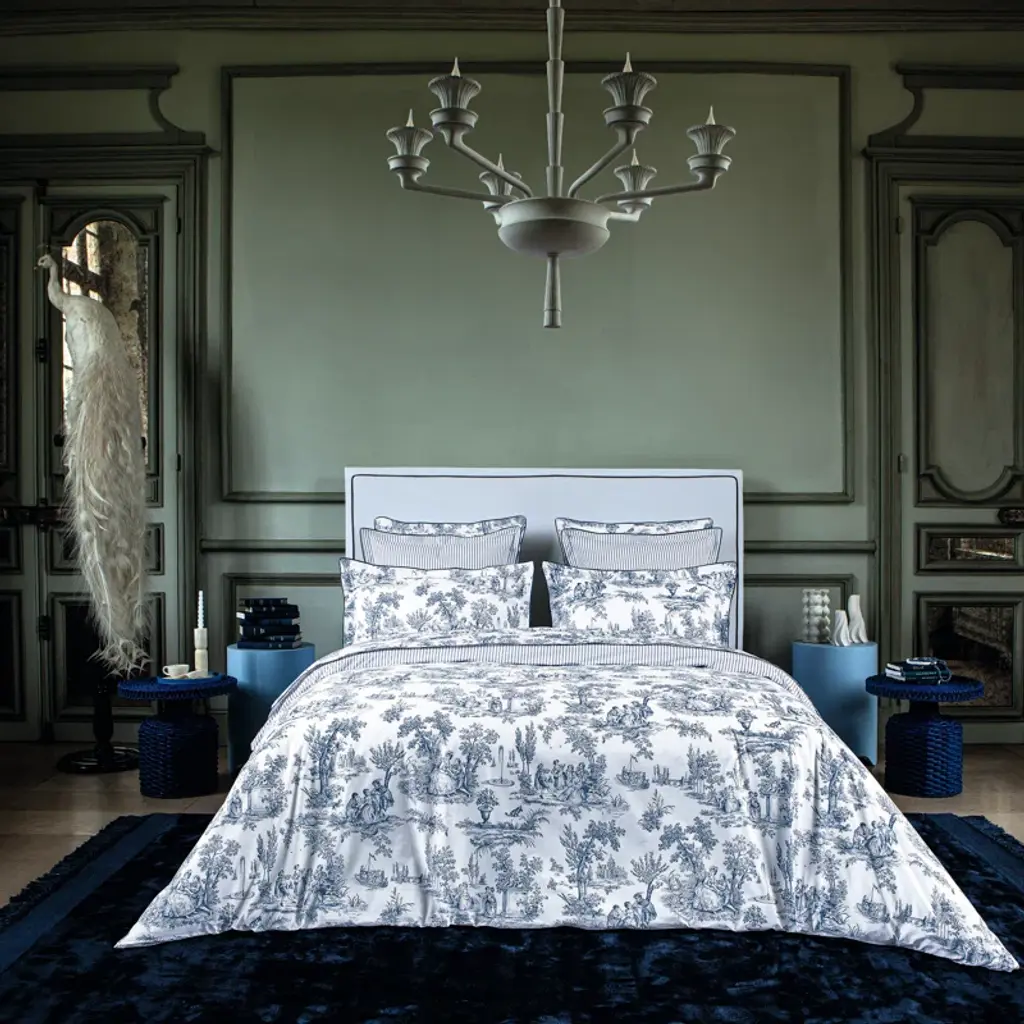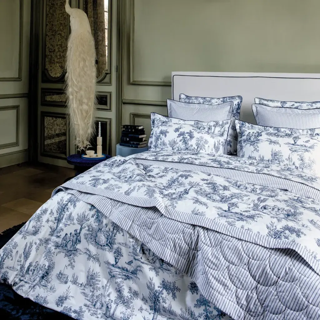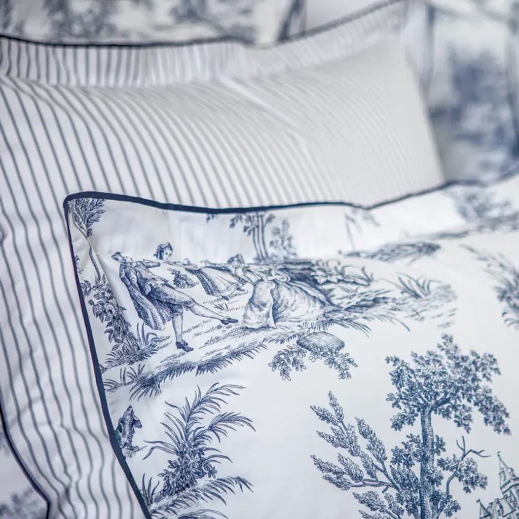 Galante is an exceptional design. One that while originating in France 244 years ago, looks modern, sophisticated, and fresh today. Discovered as a printed canvas in the textile archives of the Toile de Jouy Museum in France, reinterpreted by Anne de Solène and coordinated with a striking 3-lined stripe print. Founded in 1760 by Christophe-Philippe Oberkampf, the Oberkampf Manufactory, based in Jouy-en-Josas, then a village just outside of Paris, created textile designs inspired by the discoveries of ancient lands. The Galante shams are reversible. One side has the toile de jouy print, the other side has the 3-lined stripes print. The other side has a striped print. Lightly matelassé quilted. Percale construction. Made of organic 100% long-staple cotton. Made in France.