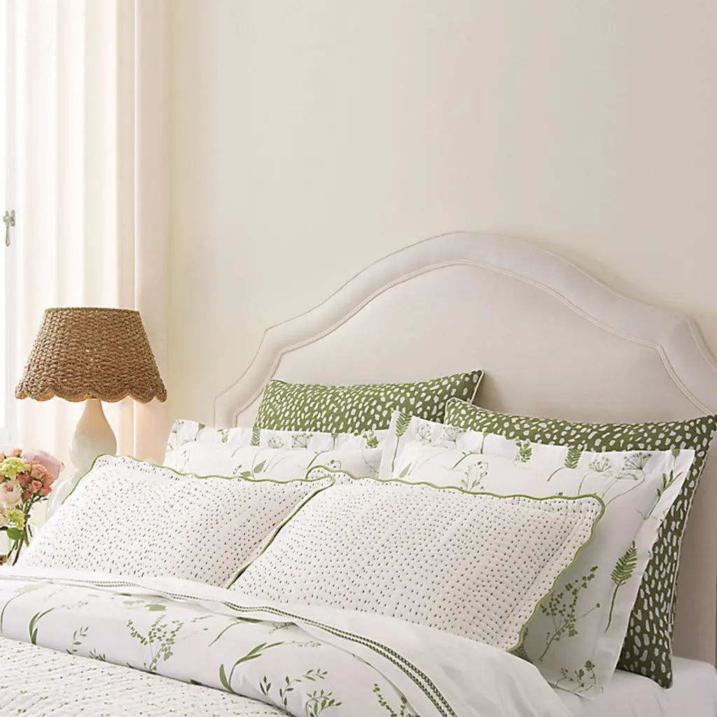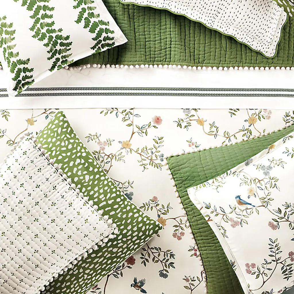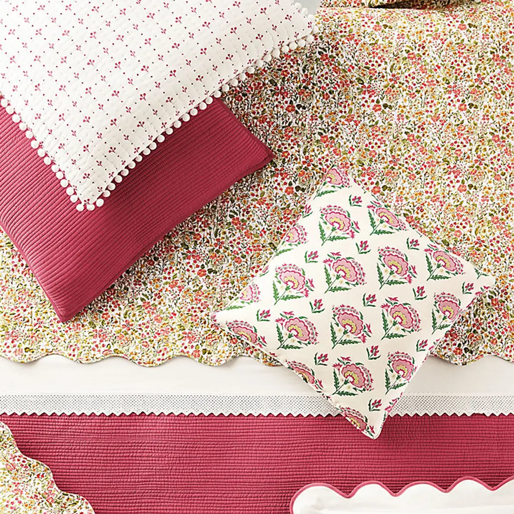 With its wonderfully soft hand and fresh, light hearted attitude, our Georgie Pom Pom Quilted Bedding has everything you dream of in a perfectly made bed. Hand quilted of supple cotton voile, the sham is printed in a sweet floral motif with vine stripe reverse, so you can change your look just by flipping it over. The edges are expertly trimmed in fabric-covered white poms poms for playful heirloom texture. Georgie Pom Pom Quilted Sham features: