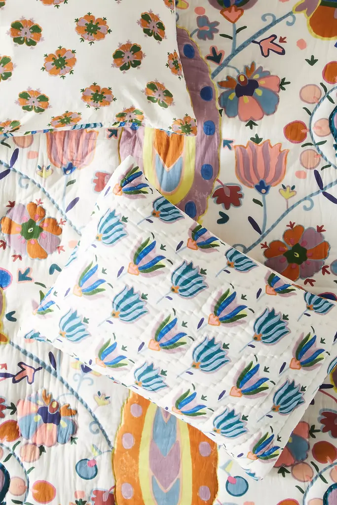 Informed by decades of technique development, the age-old process of hand screen- and block-printing has become a cultural cornerstone in Jaipur, India. The highly skilled artisans at the forefront of this practice craft each of our quilts through a time-tested method of 13 different processes, each of which is done by hand - including the final kantha stitch. From the expert color master - who blends each hue with its own unique formula - to the craftsmen and women - who, in pairs, lay down each screen frame with stunning precision - our team of makers apply their expertise and knowledge to a line of exclusive, handcrafted bedding that adds an element of unparalleled artistry to your home.Each one-of-a-kind quilted piece is crafted from a lightweight voile and finished with delicate, hand-stitched kantha. To help preserve the quality of your unique work of art, we recommend washing on a gentle cycle with care.