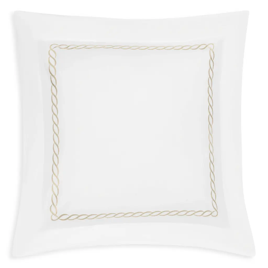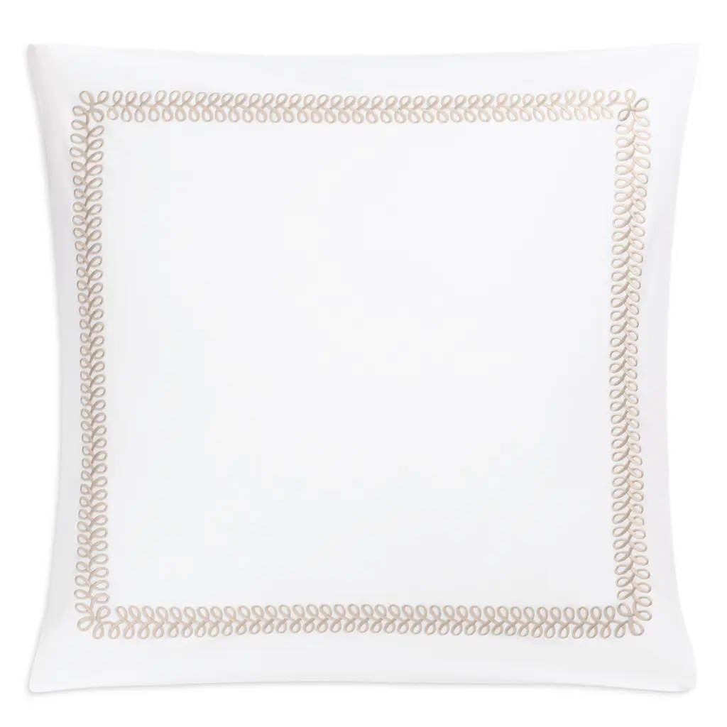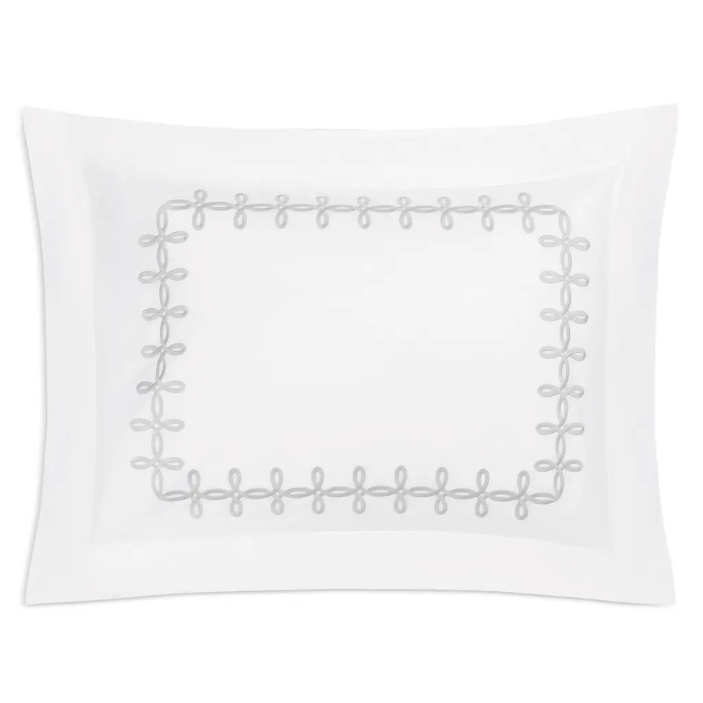 Clean, classic bedding featuring graceful embroidered knots on crisp, white 500-thread count Egyptian cotton percale. Duvet covers have embroidery running head to foot for a simple yet striking touch.