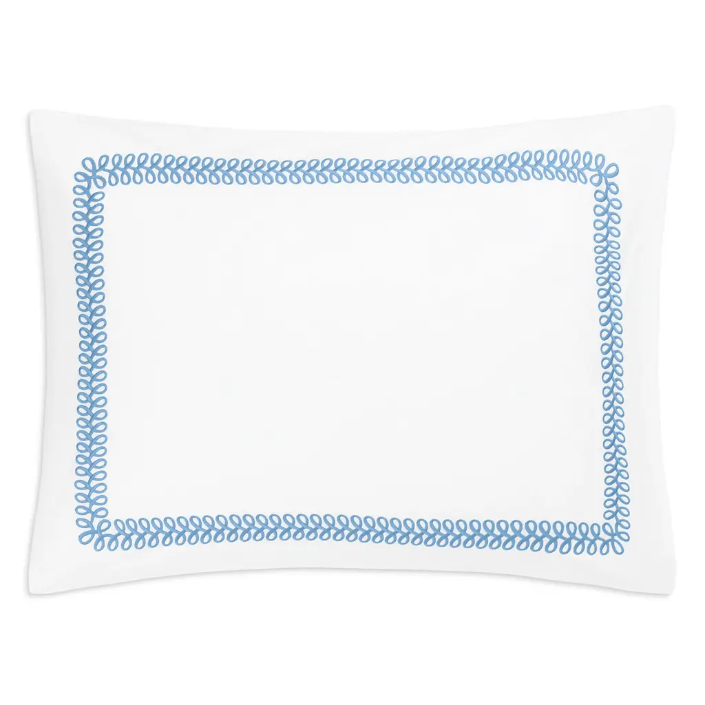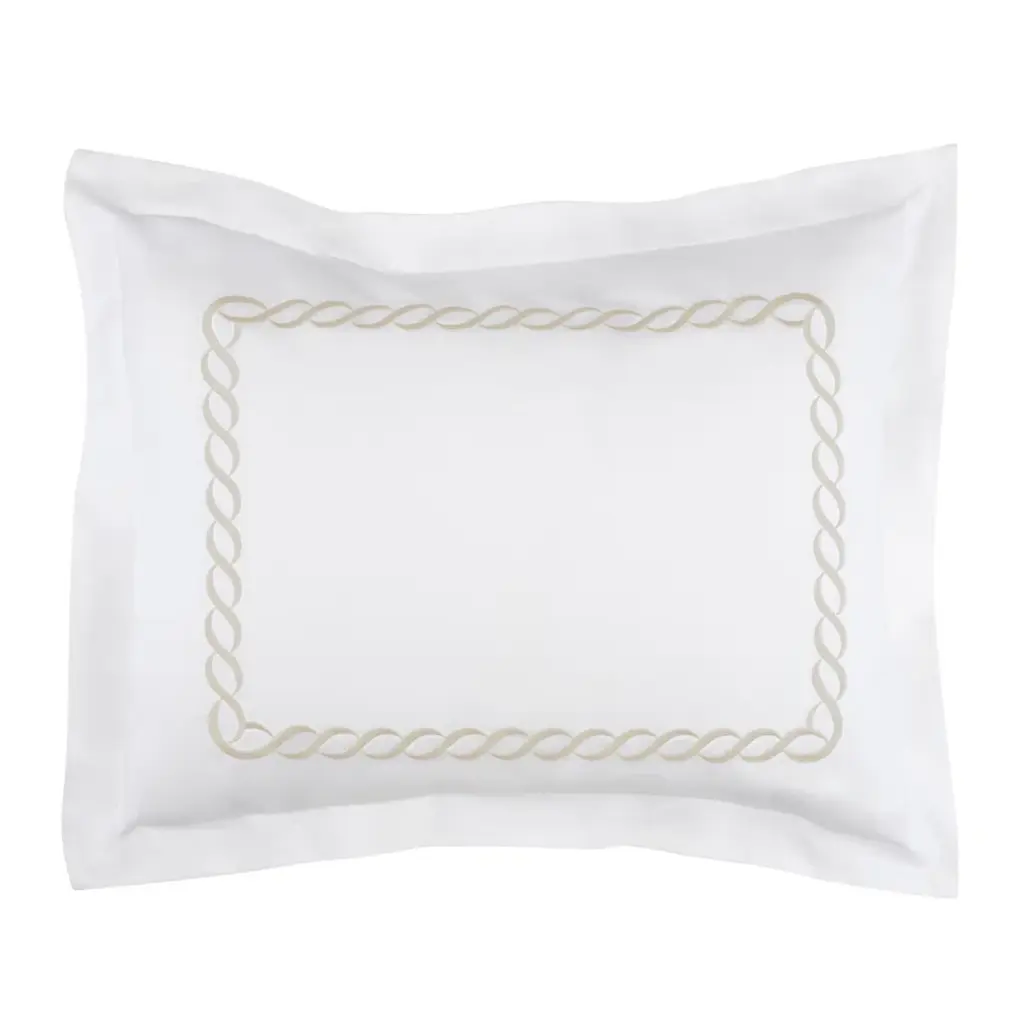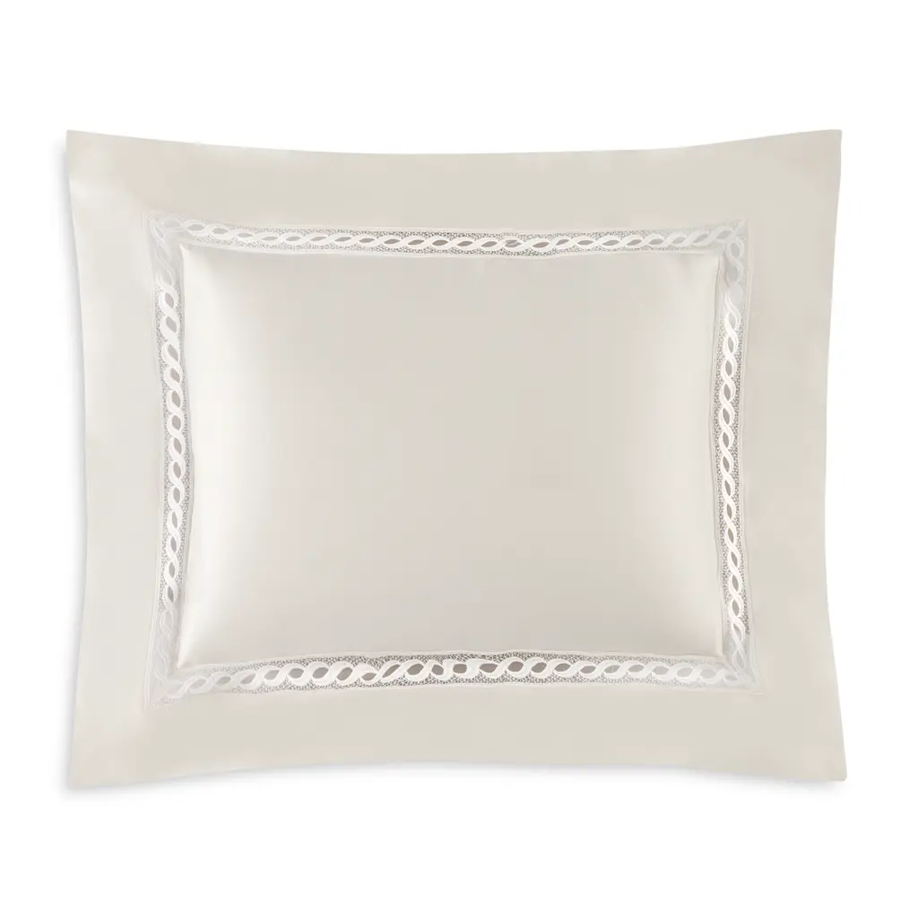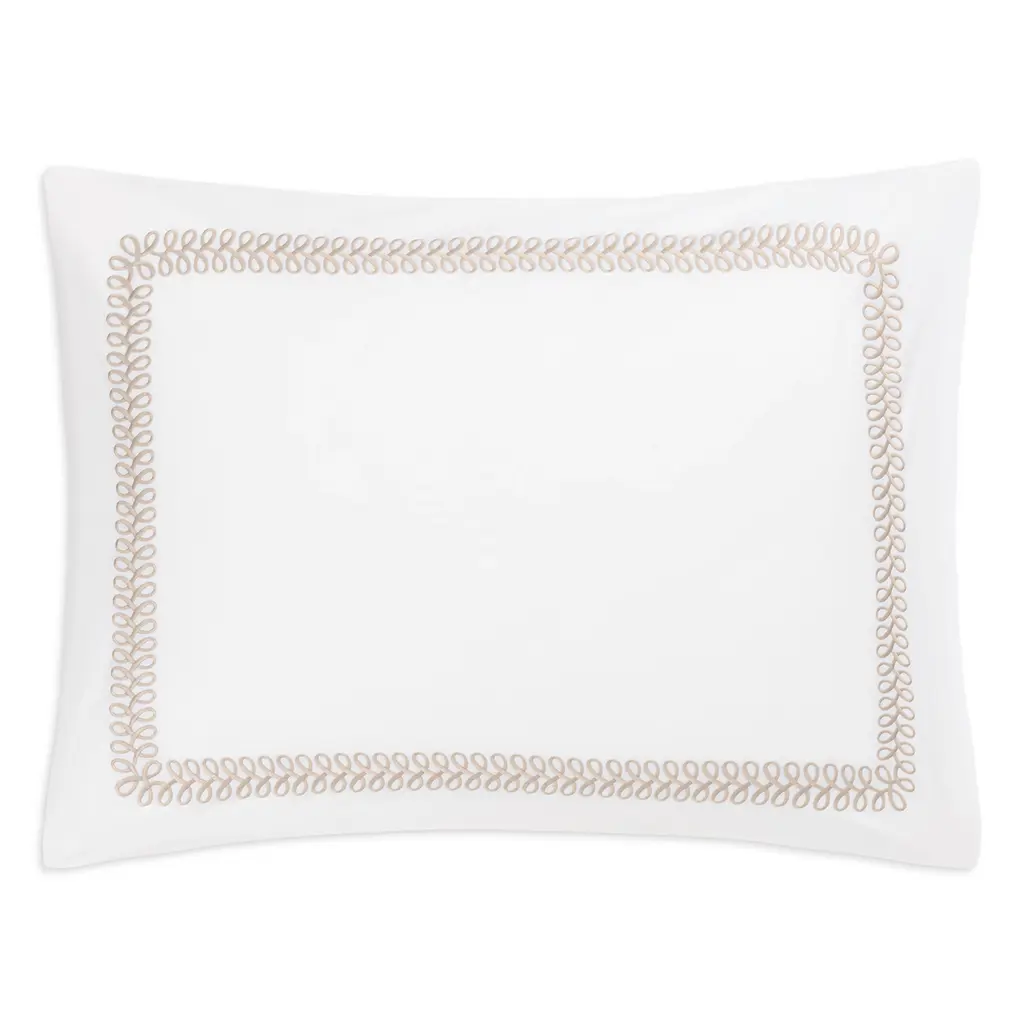 Clean, classic bedding featuring graceful embroidered knots on crisp, white 500-thread count Egyptian cotton percale. Duvet covers have embroidery running head to foot for a simple yet striking touch.