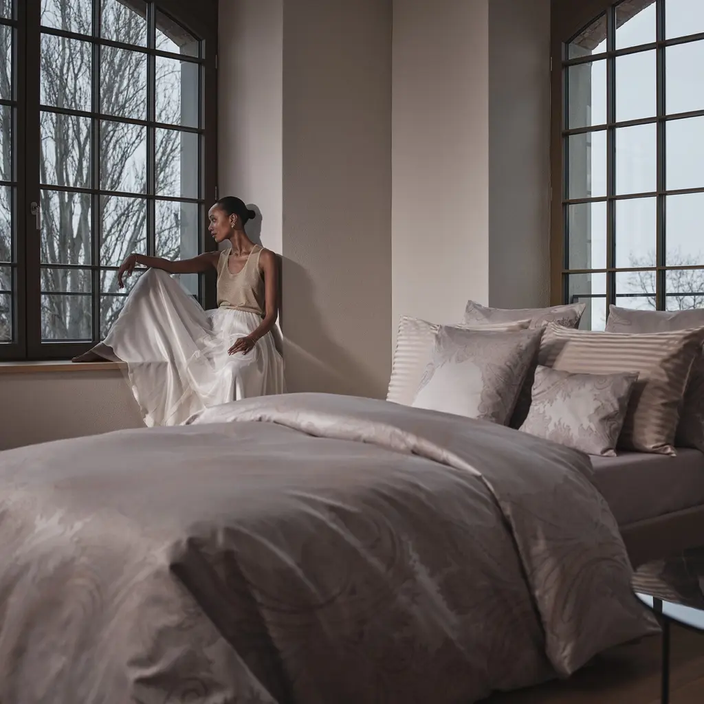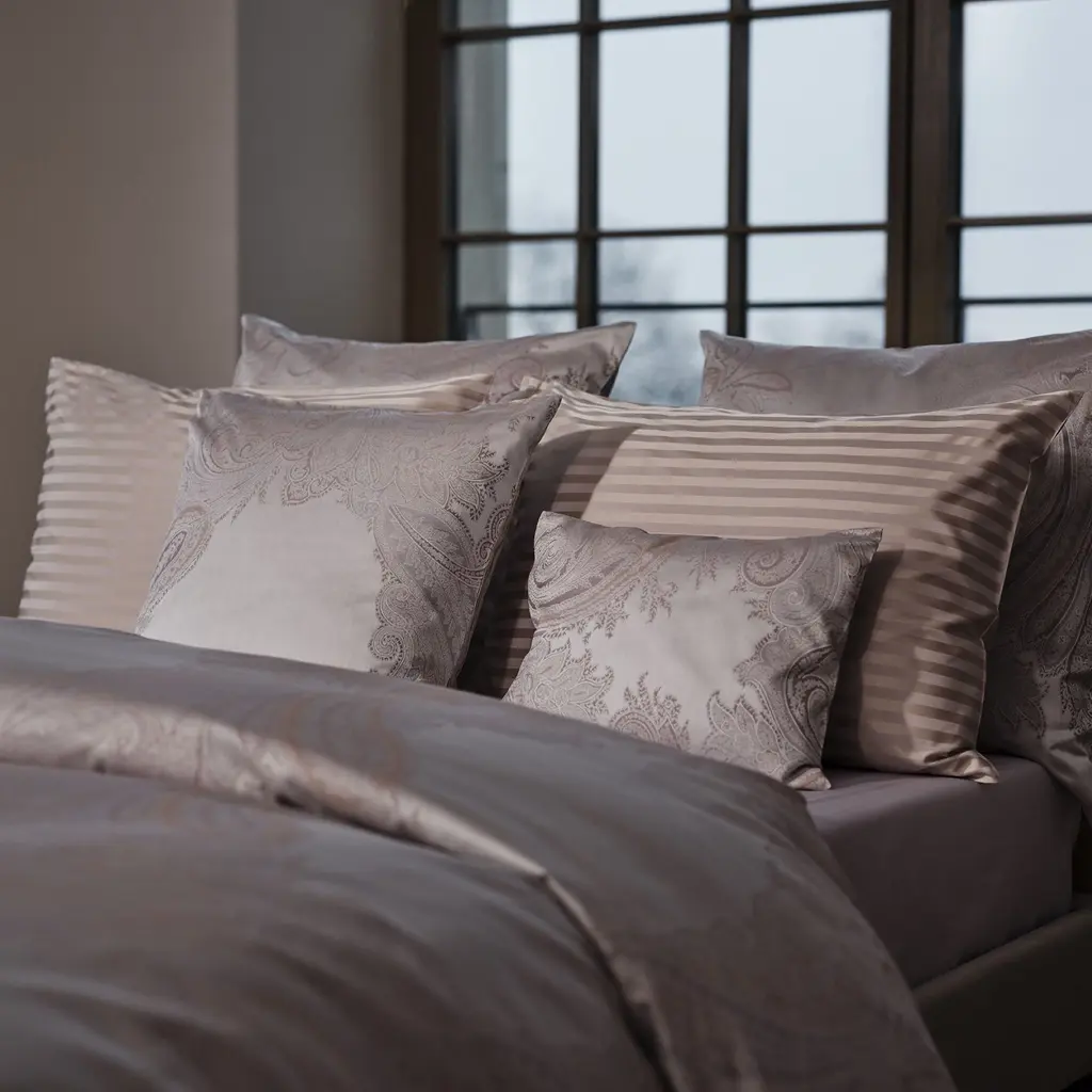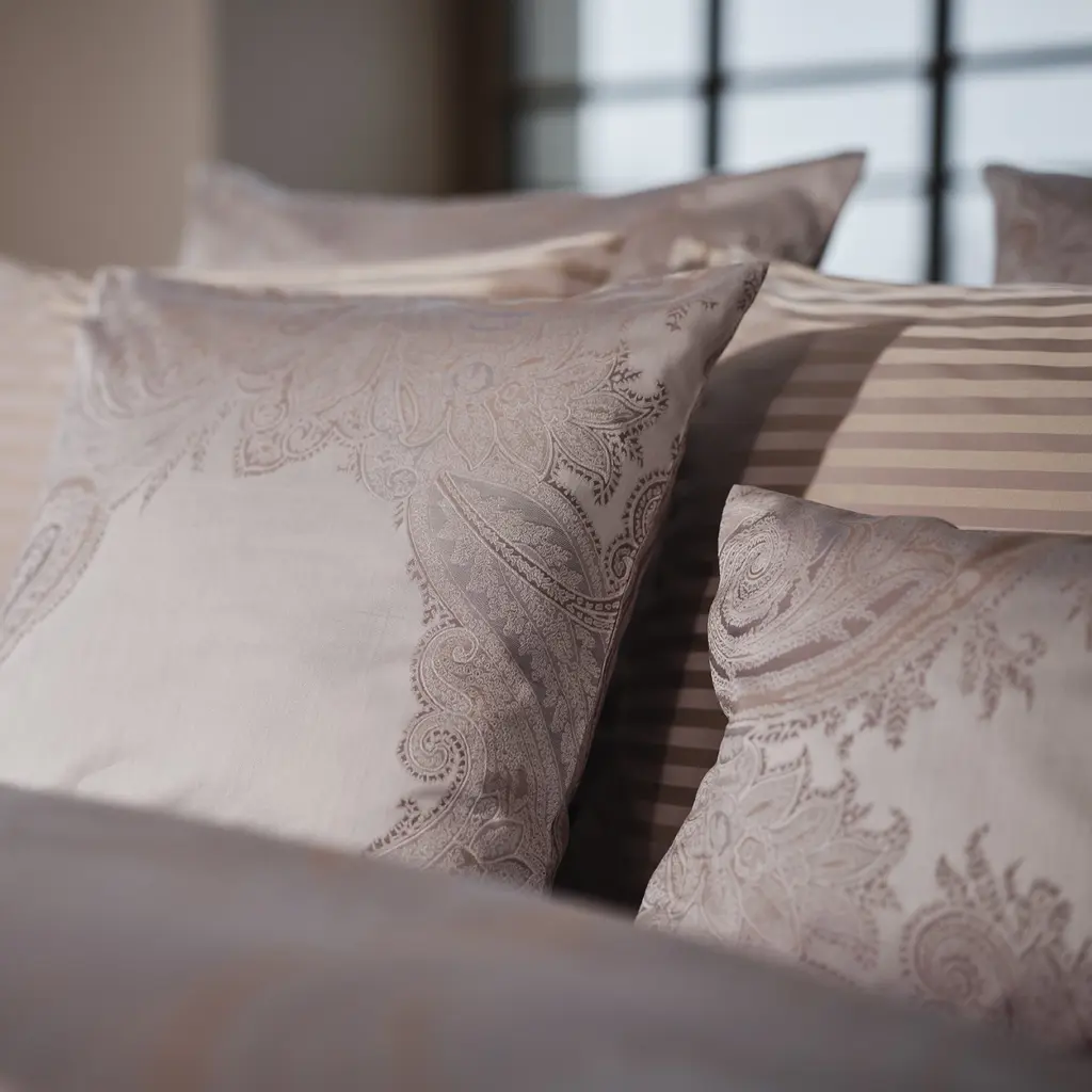 Grace is a masterpiece of jacquard weaving of the highest quality and craftsmanship. The magnificent, beautiful paisley motif is in sophisticated shades of taupe. Warp and weft colors are cleverly interwoven to create a deep, multicolored effect with the most luxurious effect.