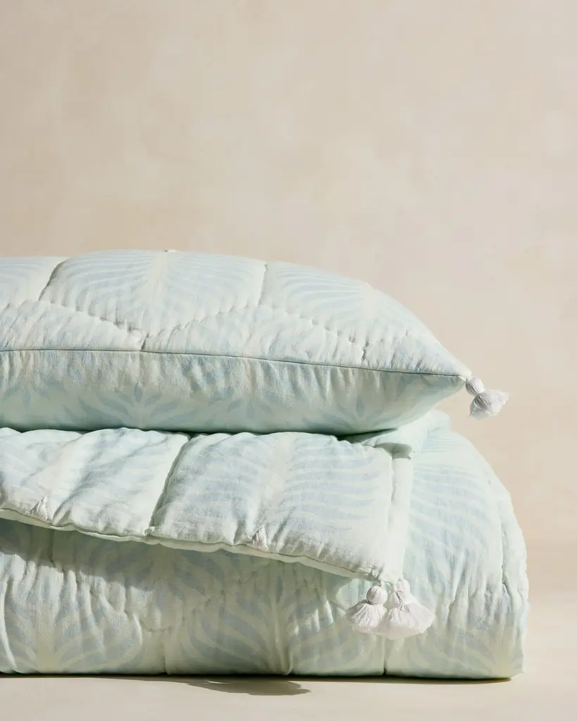 Flora. A lush bold botanic inspired by an Indian block print. Quilted by hand with tassel adornments.