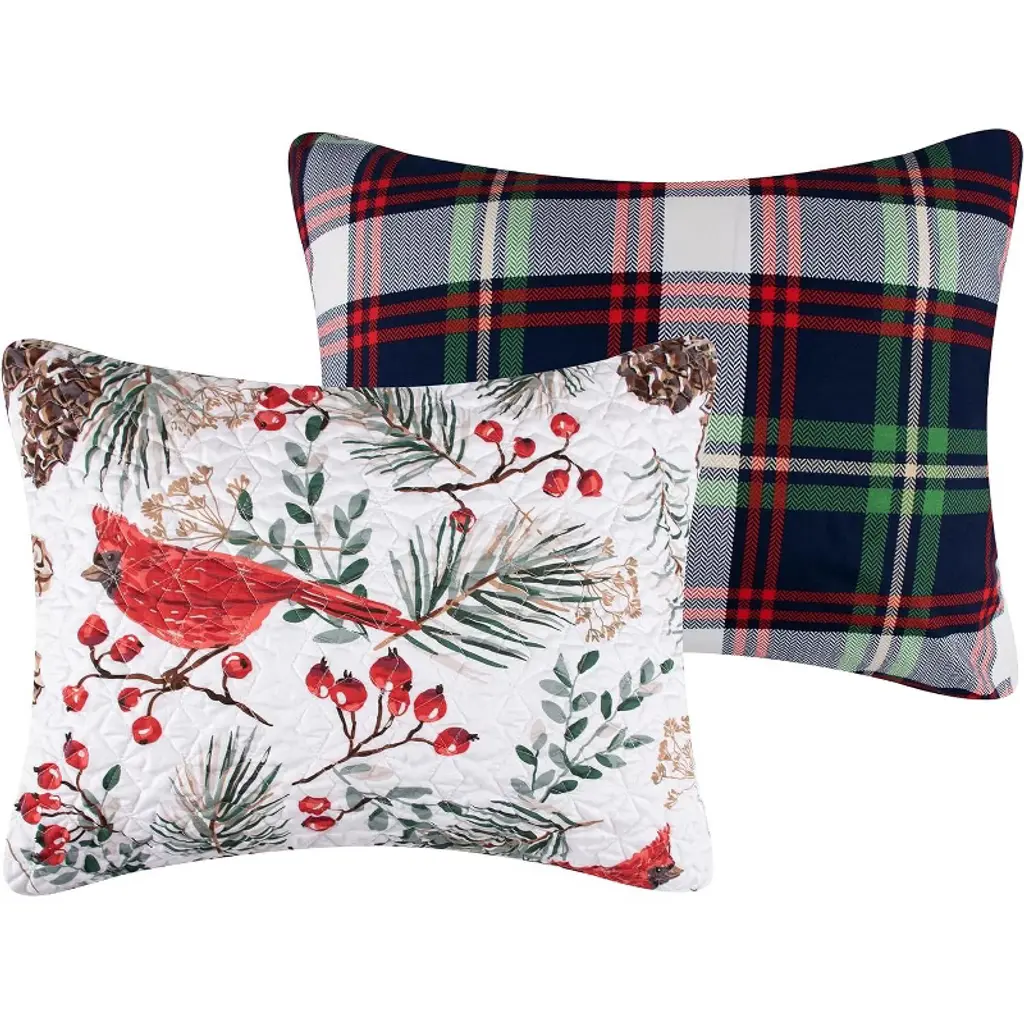 Embrace the spirit of the festive season with the Cardinal Plaid quilted pillow sham, a charming blend of holiday tradition and wintertime beauty. Featuring bright red cardinal birds perched among holly berries, evergreen sprigs, and pine cones, this sham creates a cozy white winter wonderland across your bedding. Key Features Holiday-themed cardinal birds, holly, pine cones, and snow Reverses to a festive all-over Christmas plaid Side zipper closure for secure pillow placement No two are alike due to random pattern cutting Standard sham size 20x26 inches; machine washable