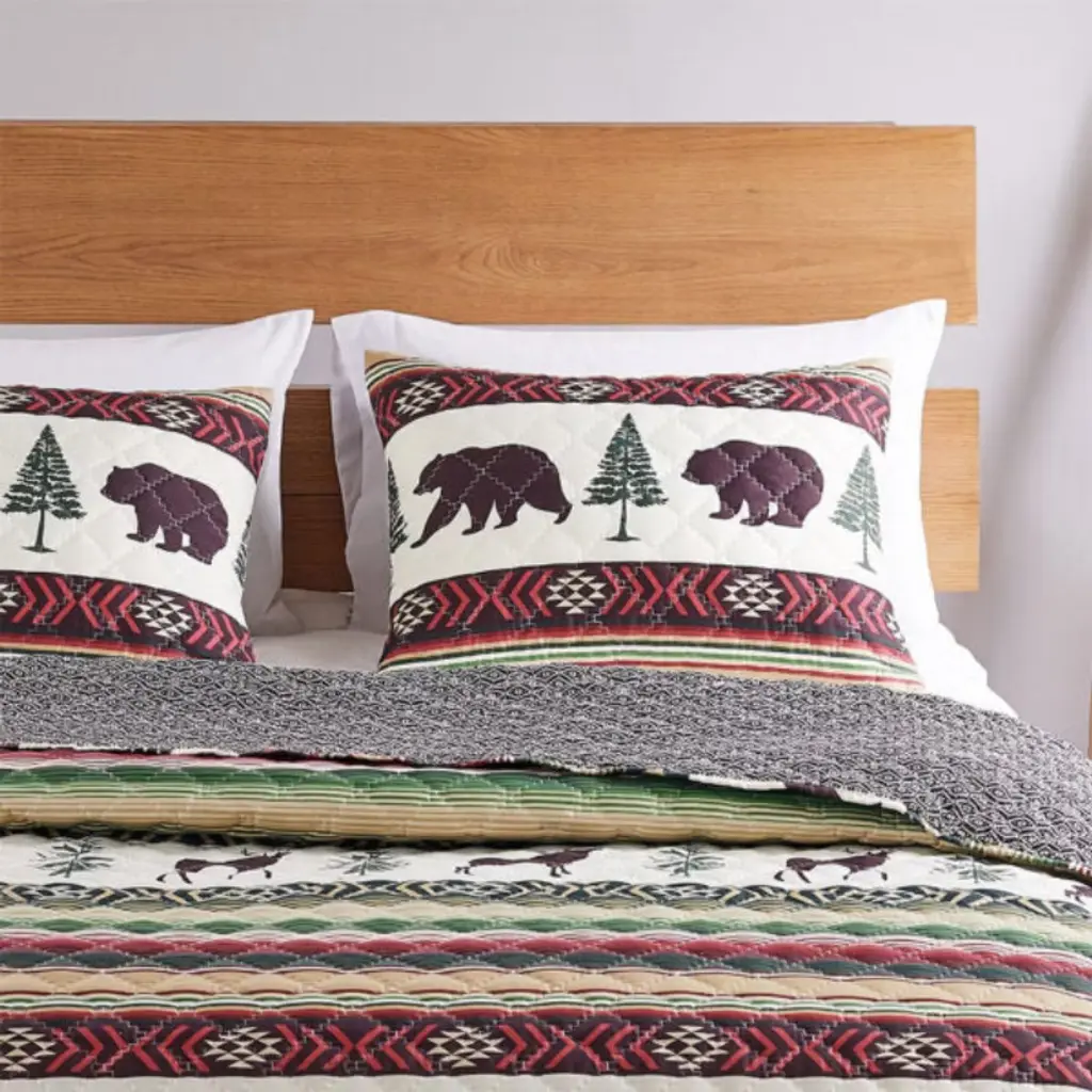 Transform your space with rustic flair. Each Yosemite sham brings a festive new perspective on lodge, with parading bear set among bold stripes and native geometric motifs. Colors include ivory, black, red, green, gold and coffee bean brown. Reversible sham features zippered side closure to hold your pillow in place and a complimentary geometric print on the back in coffee bean brown on ivory. Decorative diamond quilting enhances the durability of each piece. 100% microfiber face and back with 100% polyester fill. Dimensions: Standard sham measures 20x26``. King sham measures 20x36``. Machine Washable