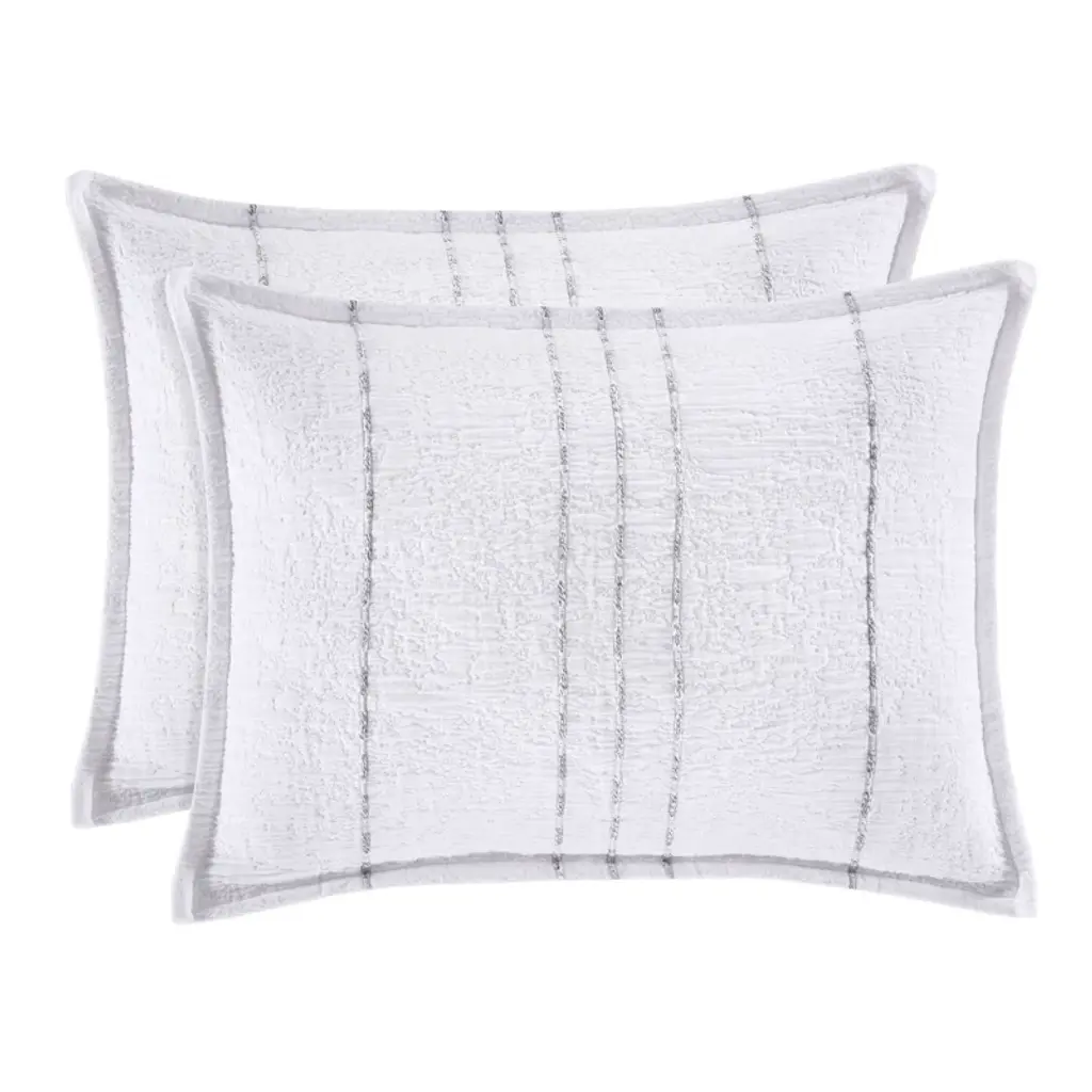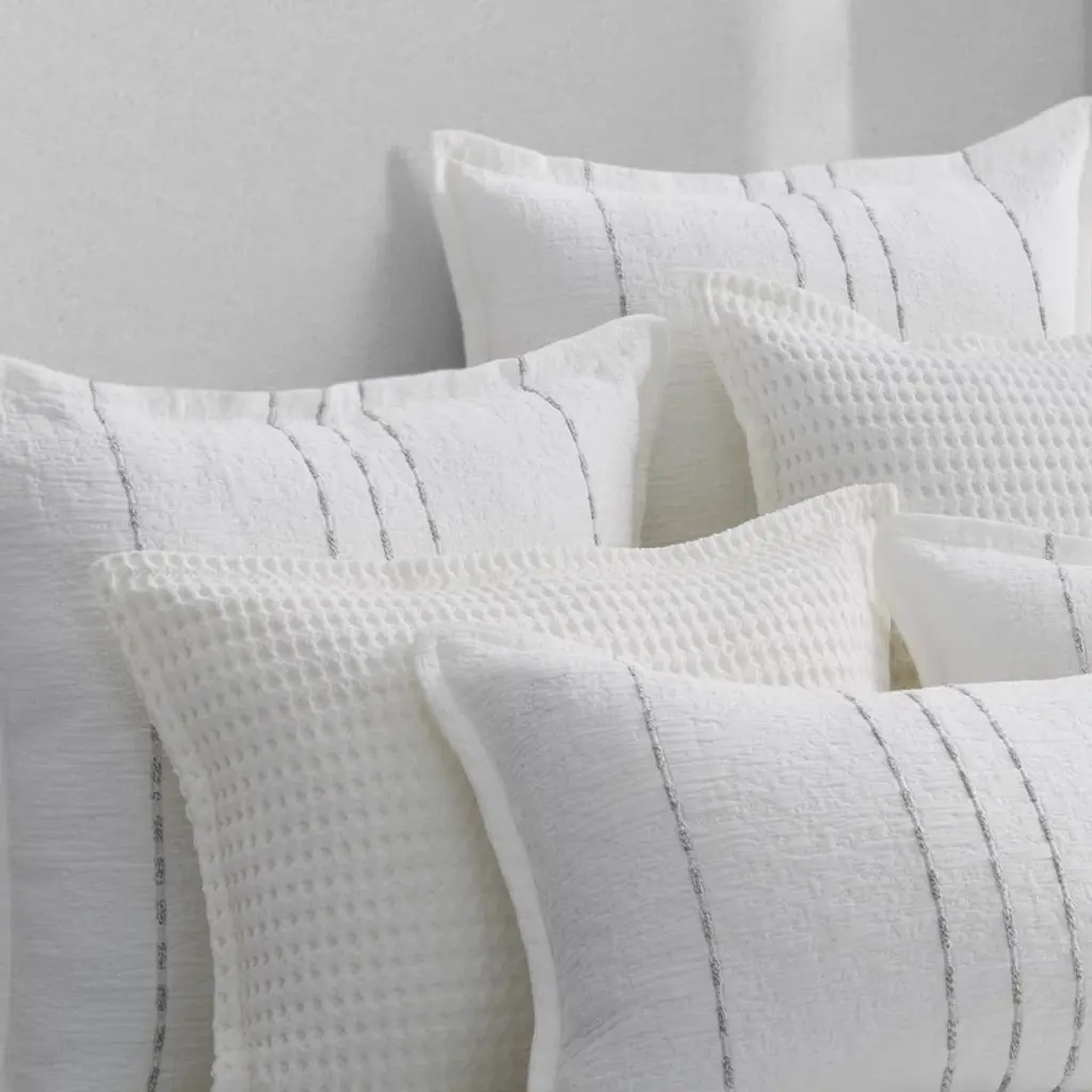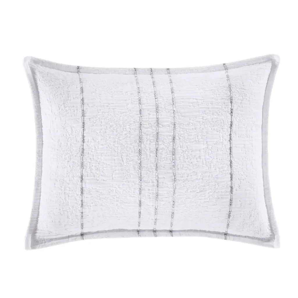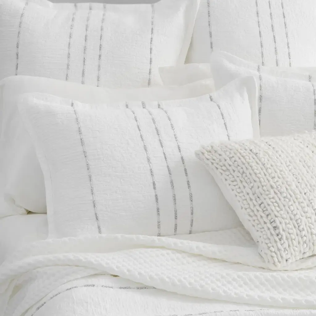 Crafted in Portugal from exceptionally fine 100% cotton yarns, the pillow sham adds relaxed versatility and effortless layering to your décor. Woven with ashen gray dash stripes that beautifully adorn the crisp white ripple-textured fabric. This lovely accent is finished with a flange trim, adding a refreshed dimension to your space, and coordinates beautifully with the collection.