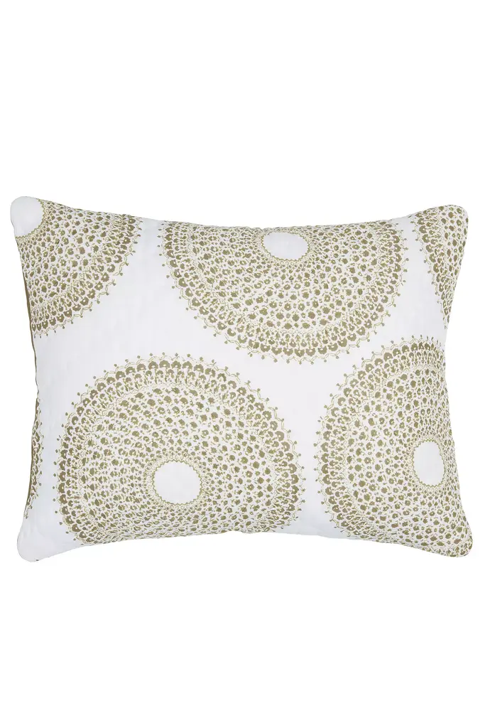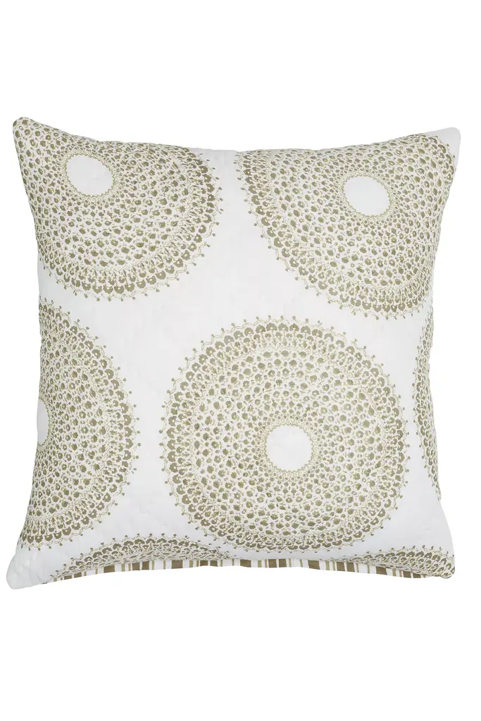 This quilt is based on a vintage woodblock we originally used for carpets. The large scale makes printing a challenge, but it's well worth the effort. Circles of light and dark peacock mesmerize the eye like a hypnotic wheel. The pattern's handcrafted look paired with soft-as-a-cloud cotton voile lends a dreamy quality – a nice complement to the modern design. Easy-to-layer hues complete the look and a pure cotton fill creates a beautiful drape. All quilts are reversible. Printed on pure cotton voile: a soft, lightweight fabric with a smooth surface. Hand quilted Coordinating stripe on back Euro (26" x 26") has hidden zipper Machine wash cold separately, delicate cycle, tumble dry low, do not bleach, iron at medium setting if necessary. Imported