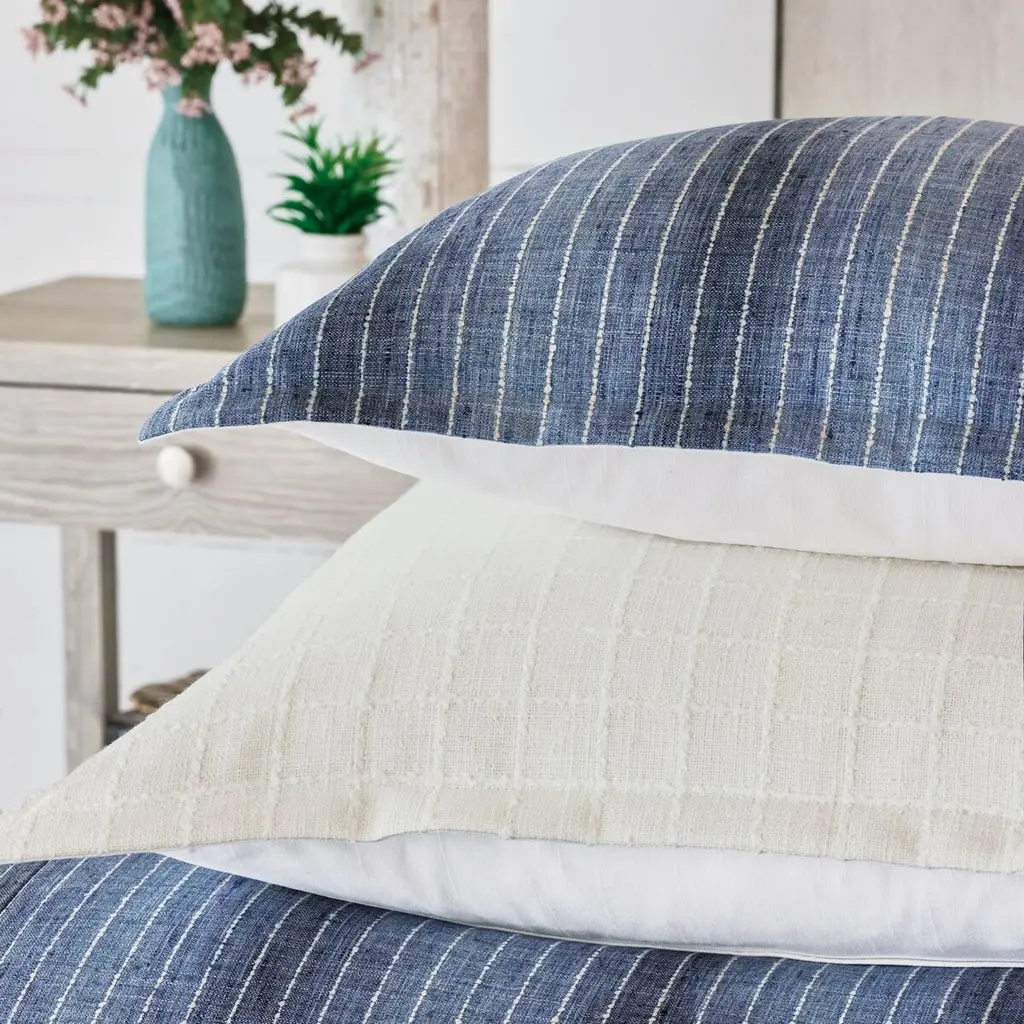 White pinstripes are stitched against denimlike fabric with broader tonal blue stripes on this front of this pillow sham; the reverse is snow-white cotton. It comes with a feather-filled insert for optimal plushness.