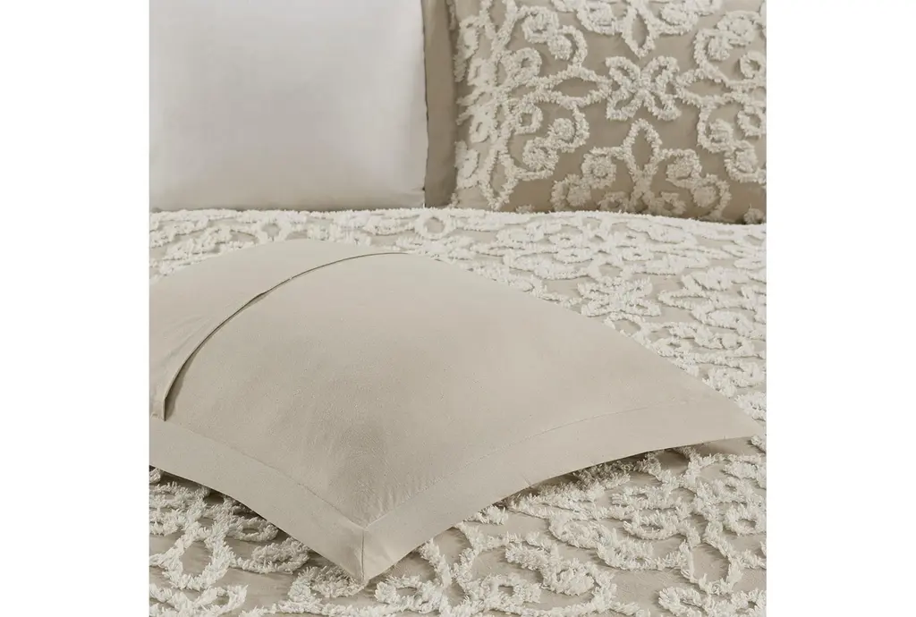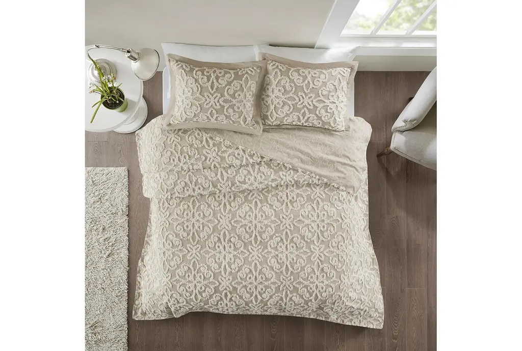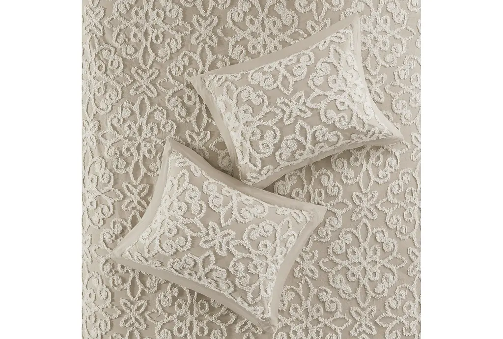 Transform your bedroom with the King/Cal King Bedspread in Taupe. This Sabrina Tufted Cotton 3 Piece Set includes 1 bedspread and 2 king shams, providing a complete and cozy look. The cotton chenille with tufted technique adds a touch of boho style to your space while ensuring comfort and softness.