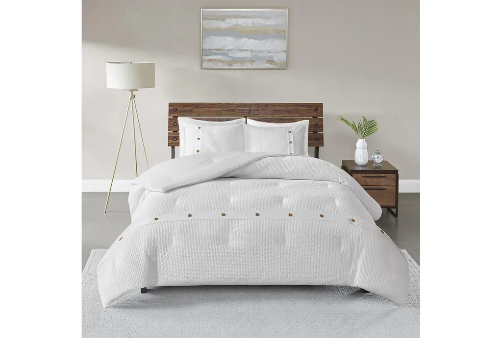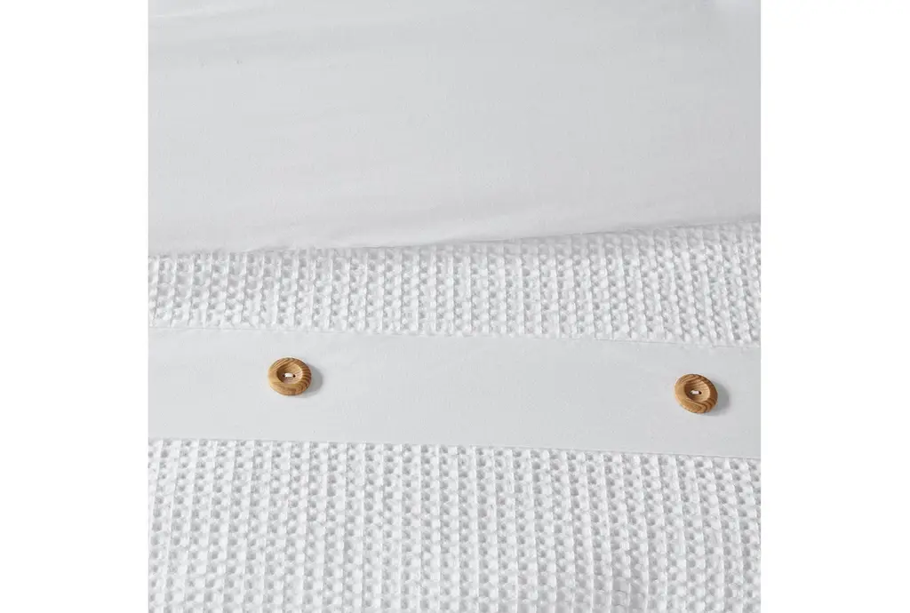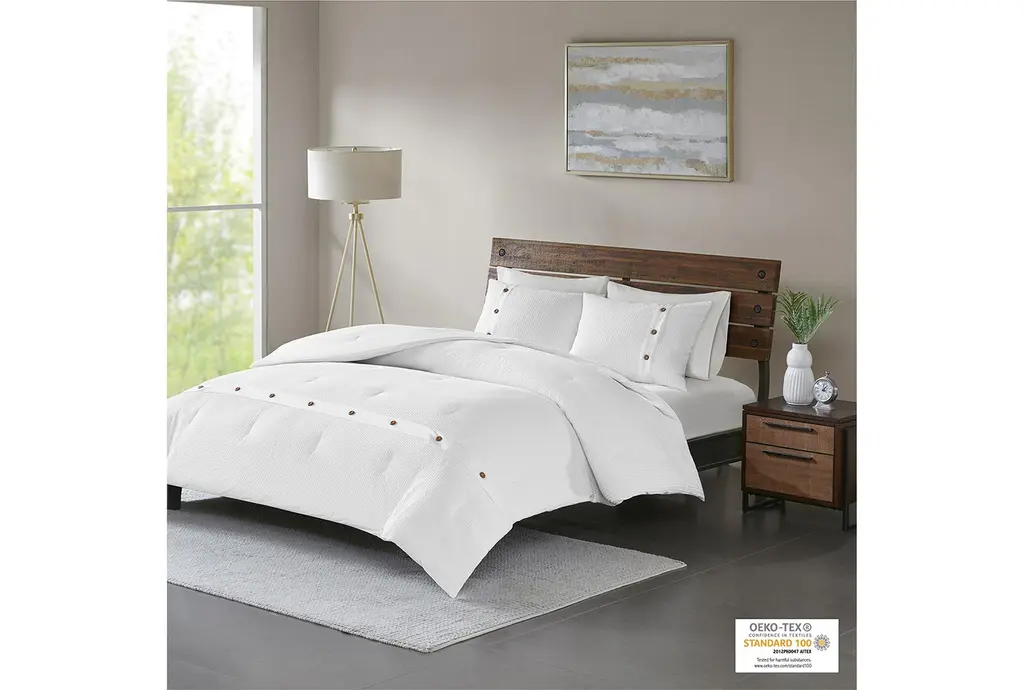 Transform your bedroom into a cozy retreat with the King / California King Comforter Set in White Finley Cotton Waffle Weave. This 3-piece set includes a comforter and two standard shams, all designed to provide ultimate comfort and style. The waffle texture and button decoration add a touch of casual charm to your bedding.