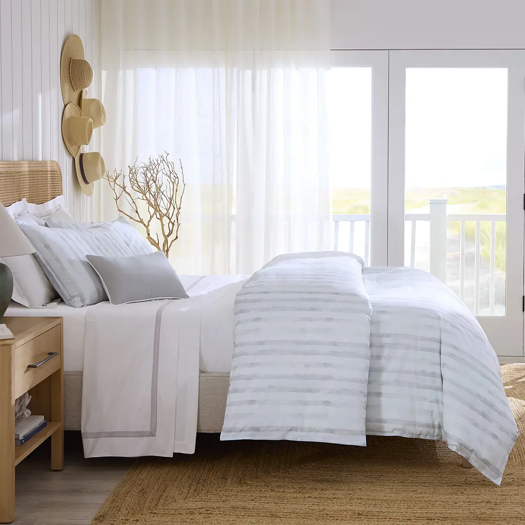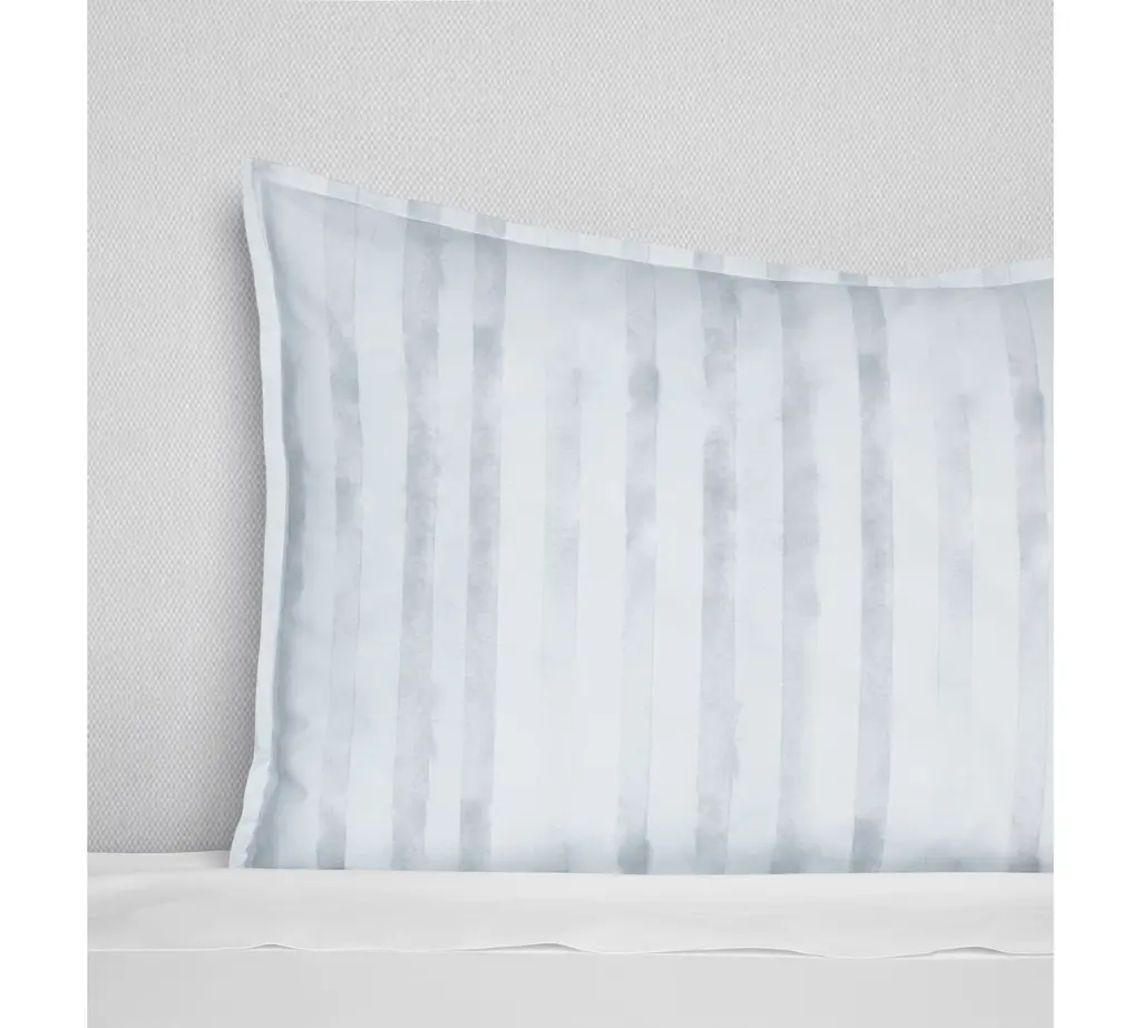 An all-over faded watercolor stripe adorns Kricia's Italian woven long-staple cotton percale evoking the soft sundrenched allure of cabana fabrics. In a lunar palette of blue-gray each subtle line flows with a painterly grace while mini flanges add a refined edge to this serene dreamlike bedding.