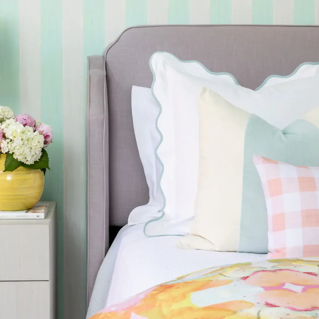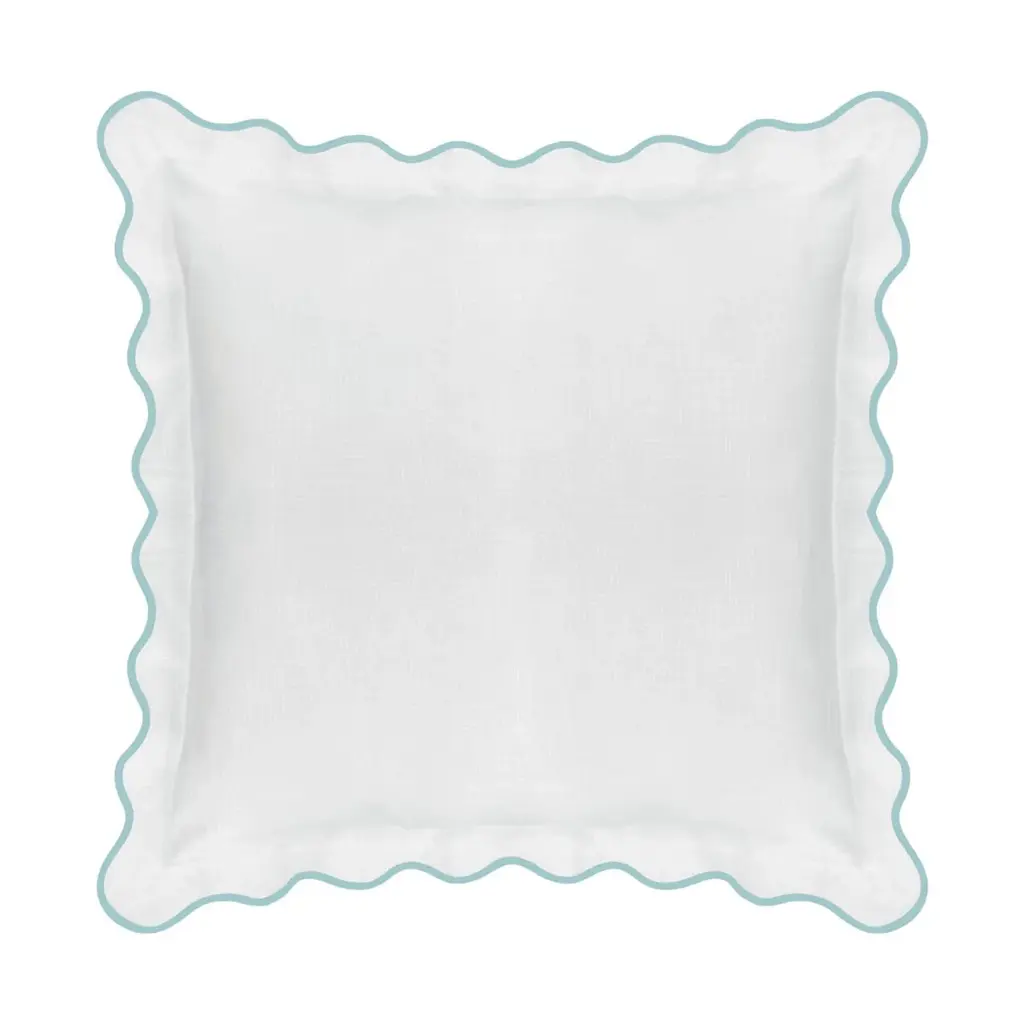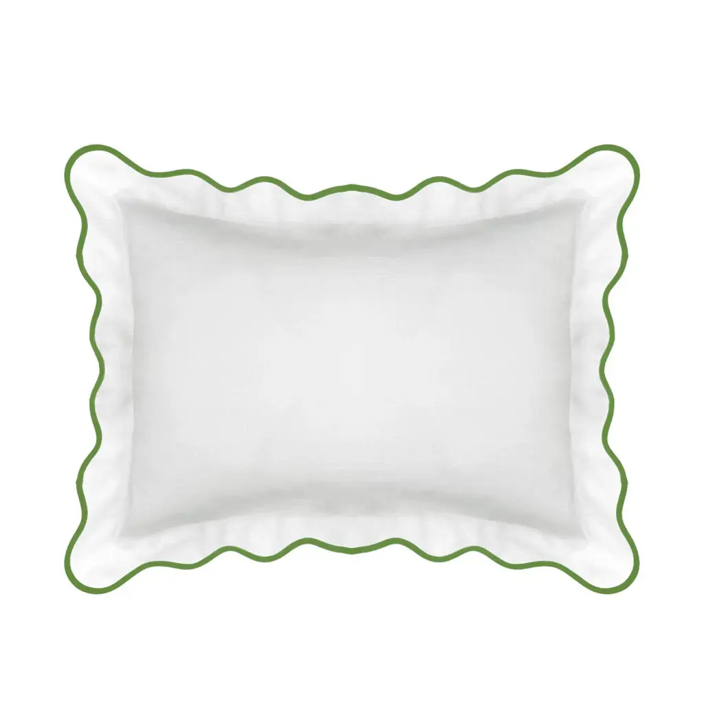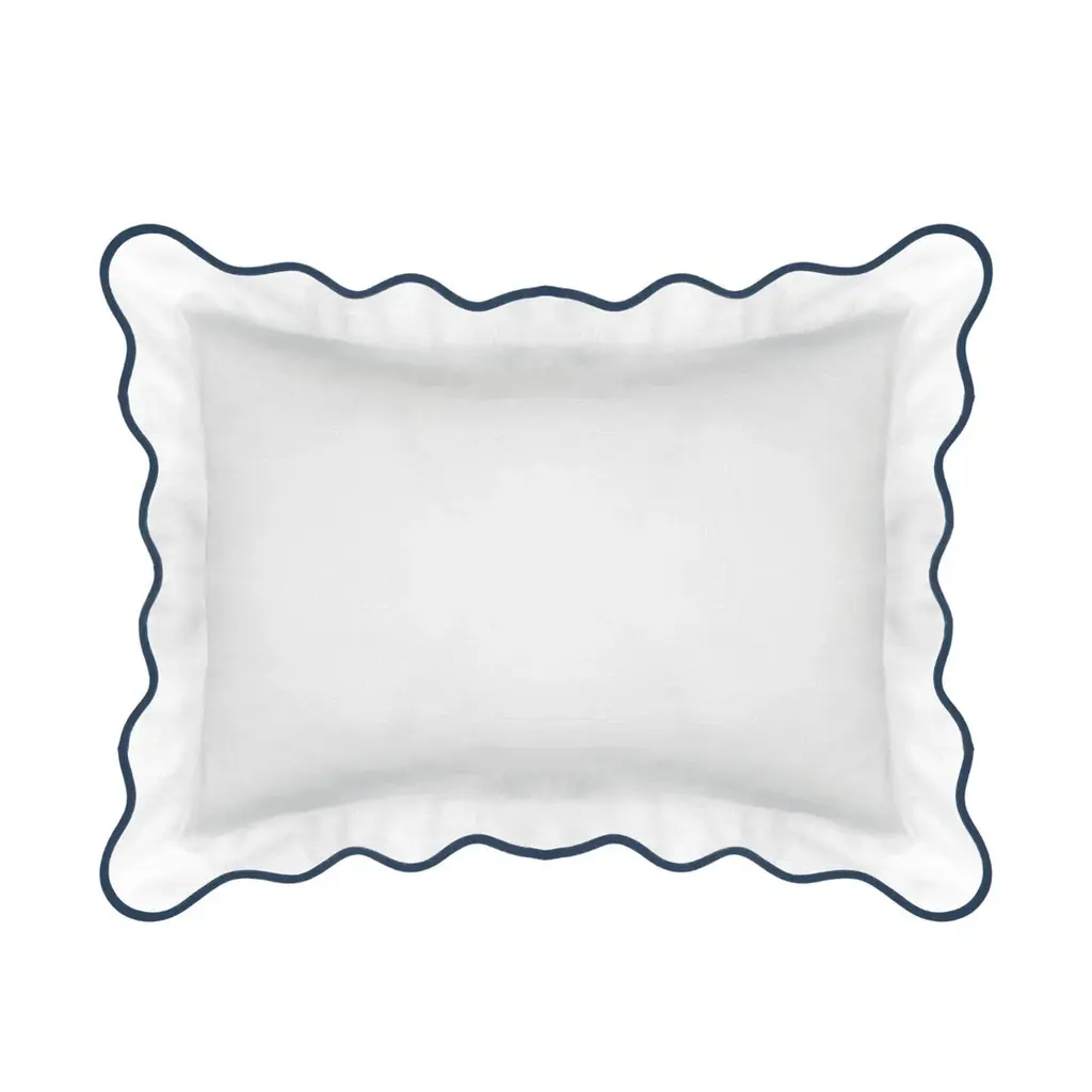 26x26 Euro sham or 26" x 20" standard sham 100% Cotton Colored scalloped trim 2.5" Flange Ships via UPS Zippered closure Care Instructions: Machine wash cold with like colors. Do not bleach. Tumble dry low. Use medium iron. Free shipping in the U.S.