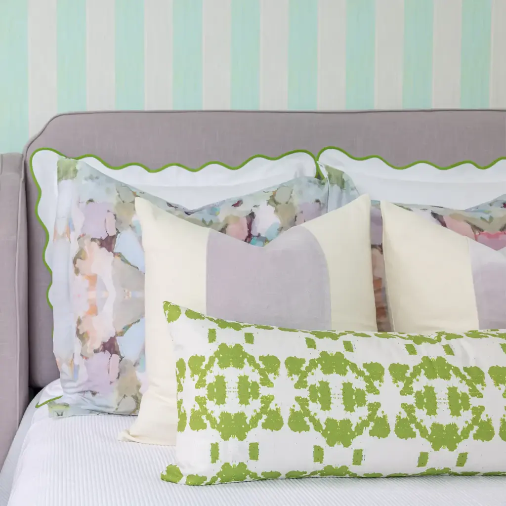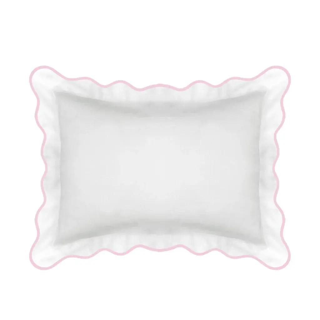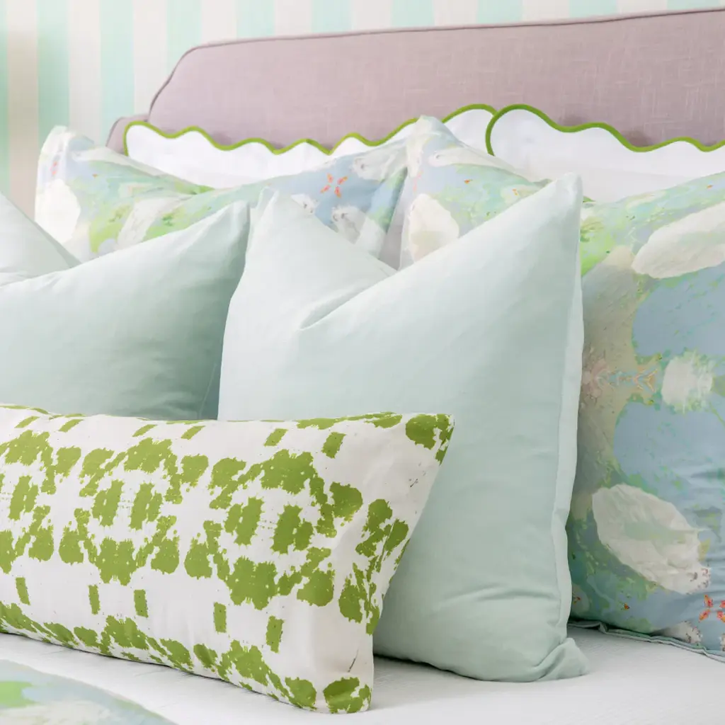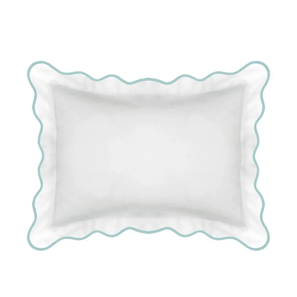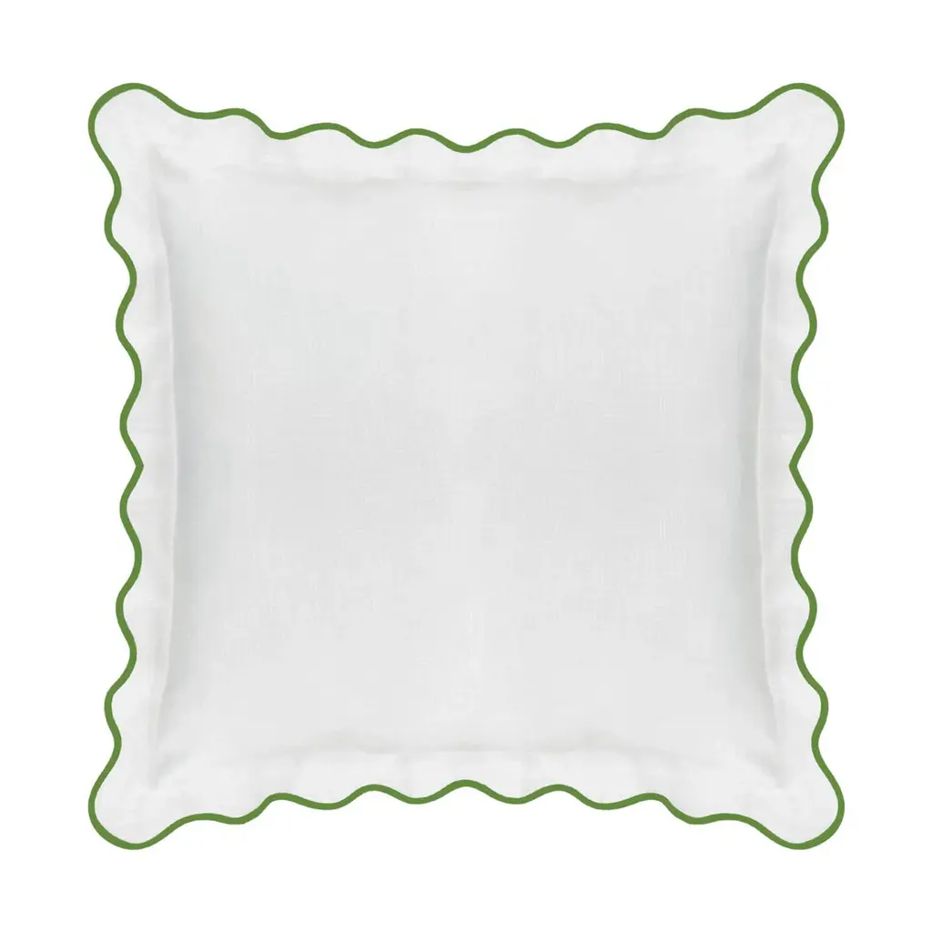 26x26 Euro sham or 26" x 20" standard sham 100% Cotton Colored scalloped trim 2.5" Flange Ships via UPS Zippered closure Care Instructions: Machine wash cold with like colors. Do not bleach. Tumble dry low. Use medium iron. Free shipping in the U.S.