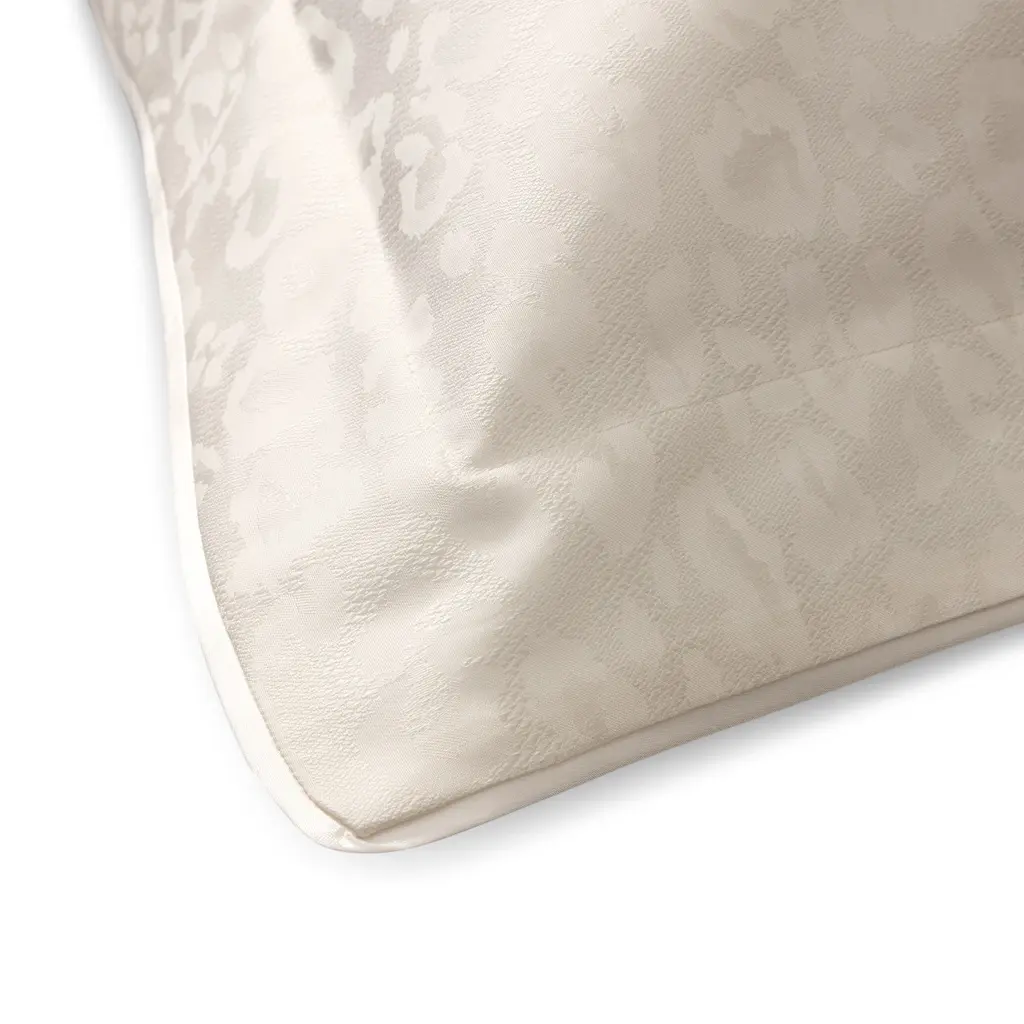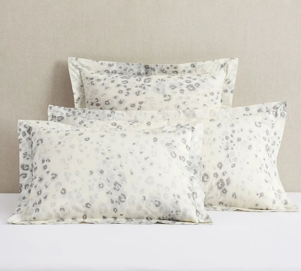 A trendy snow leopard pattern combines luxury, softness and elegance on the Leopard Bedding Collection from Yves Delorme. Duvet cover and shams are made using a Jacquard fabric for the front side and Adagio Milk solid color for the reverse. The flat sheet is Adagio milk with a five turn down using the Jacquard fabric.
