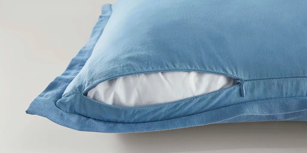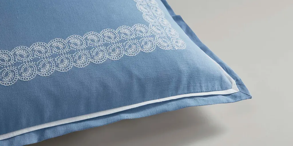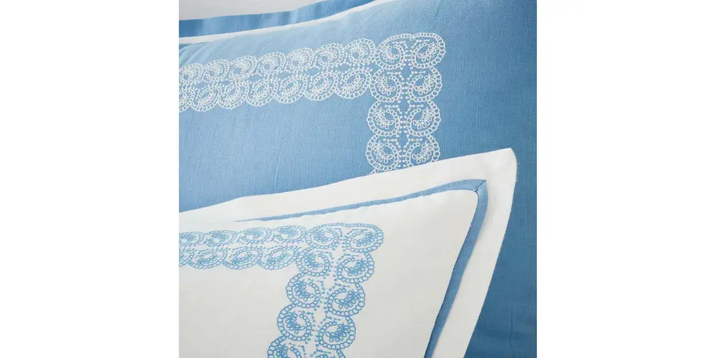 With intricate detailing that can be dressed up or down and a soft, welcoming touch, the Lexington collection embodies livable luxury. Machine embroidered to precisely execute a delicate bordered design in a contrasting blue thread on ivory-colored base cloth. Blue piping encompasses the border to elevate the design. The tailored edge is finished with a 1 flange and mitered corners.