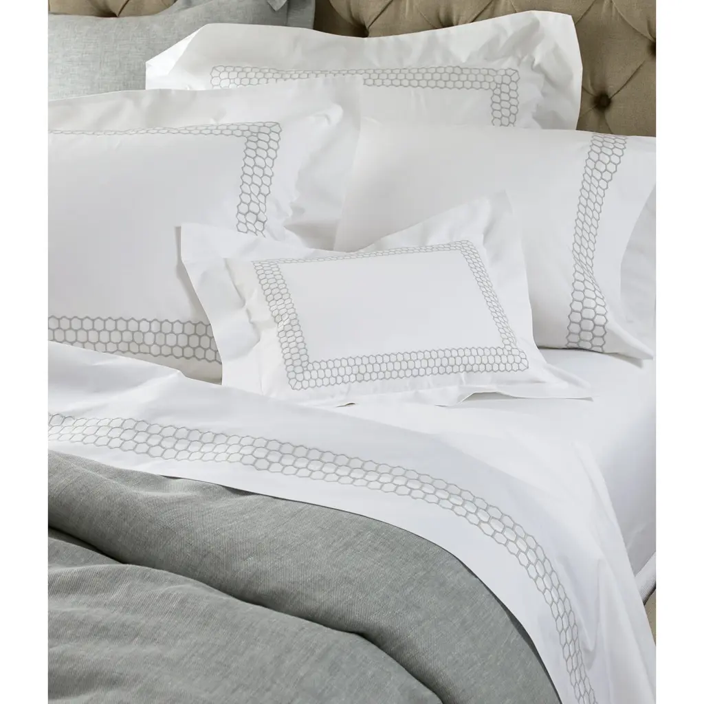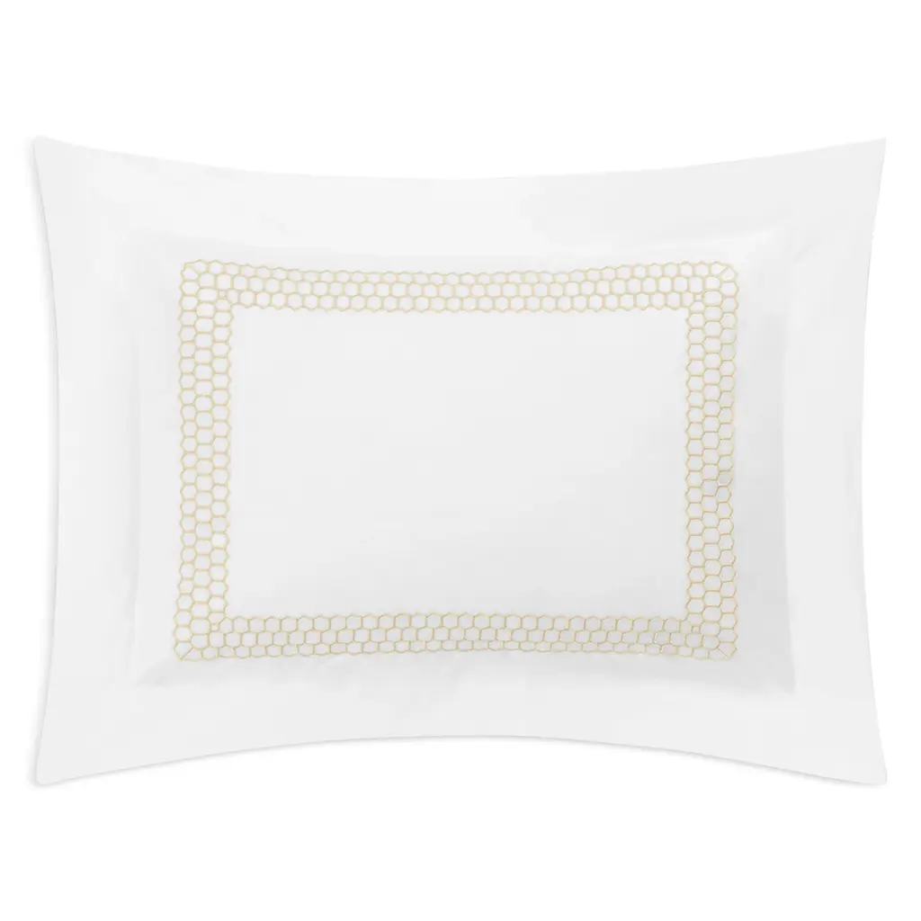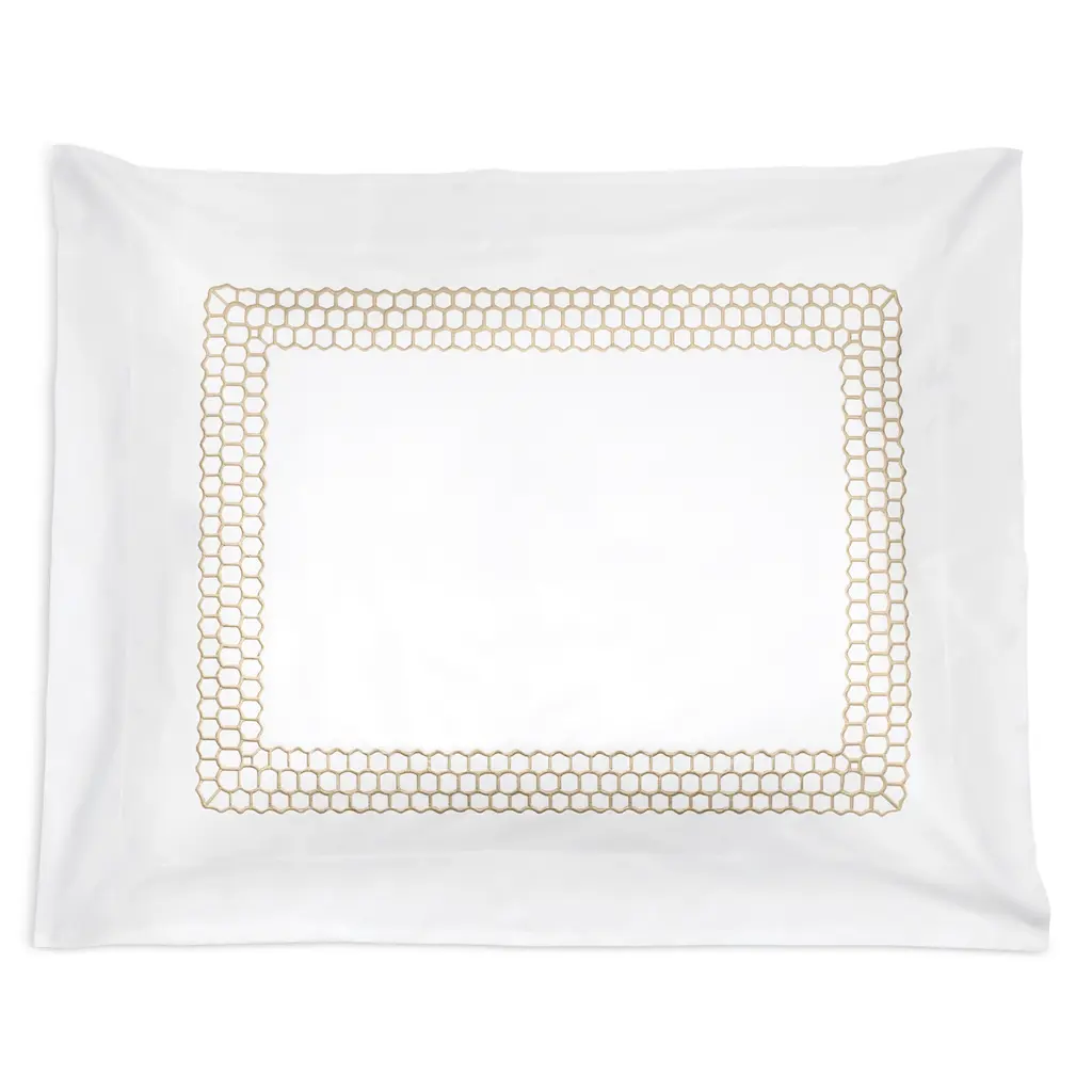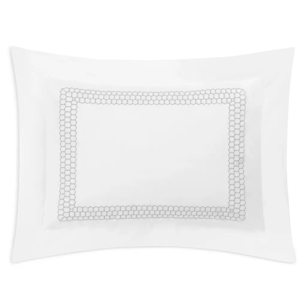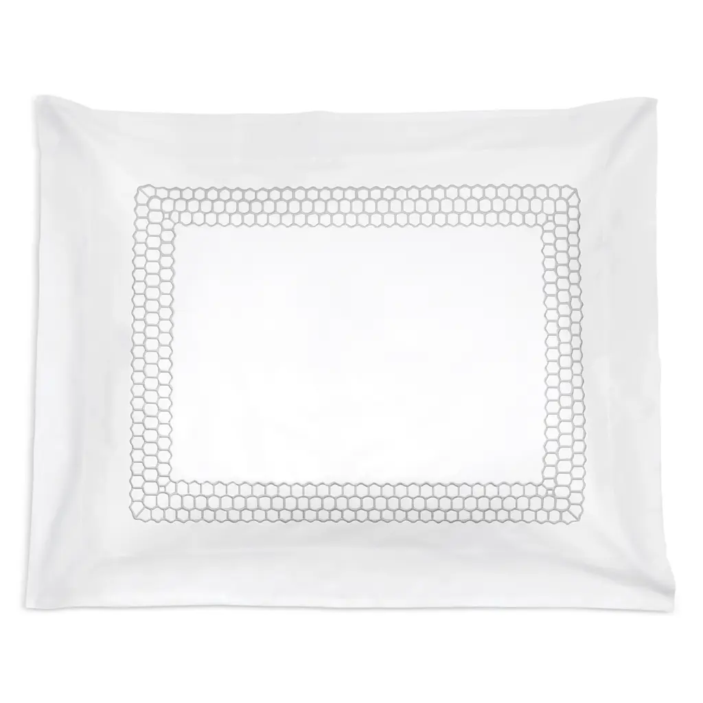 Crafted in luxurious, crisp 520-thread count cotton percale, this sham by Matouk features a frame of geometric embroidery.