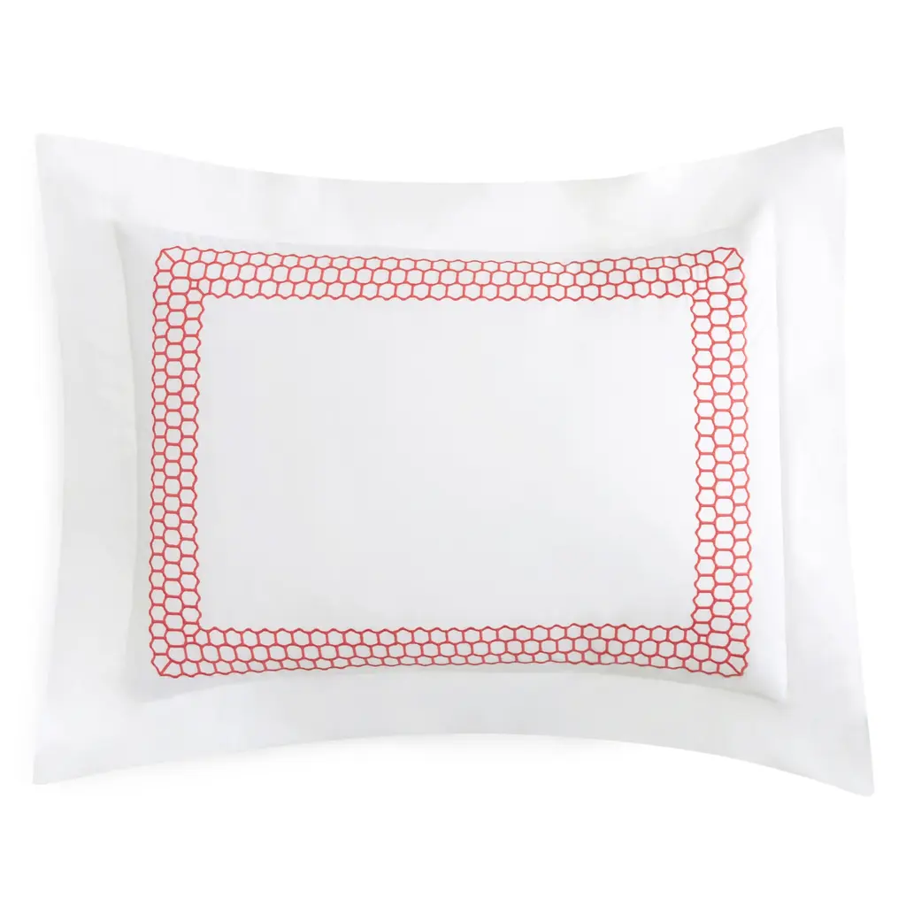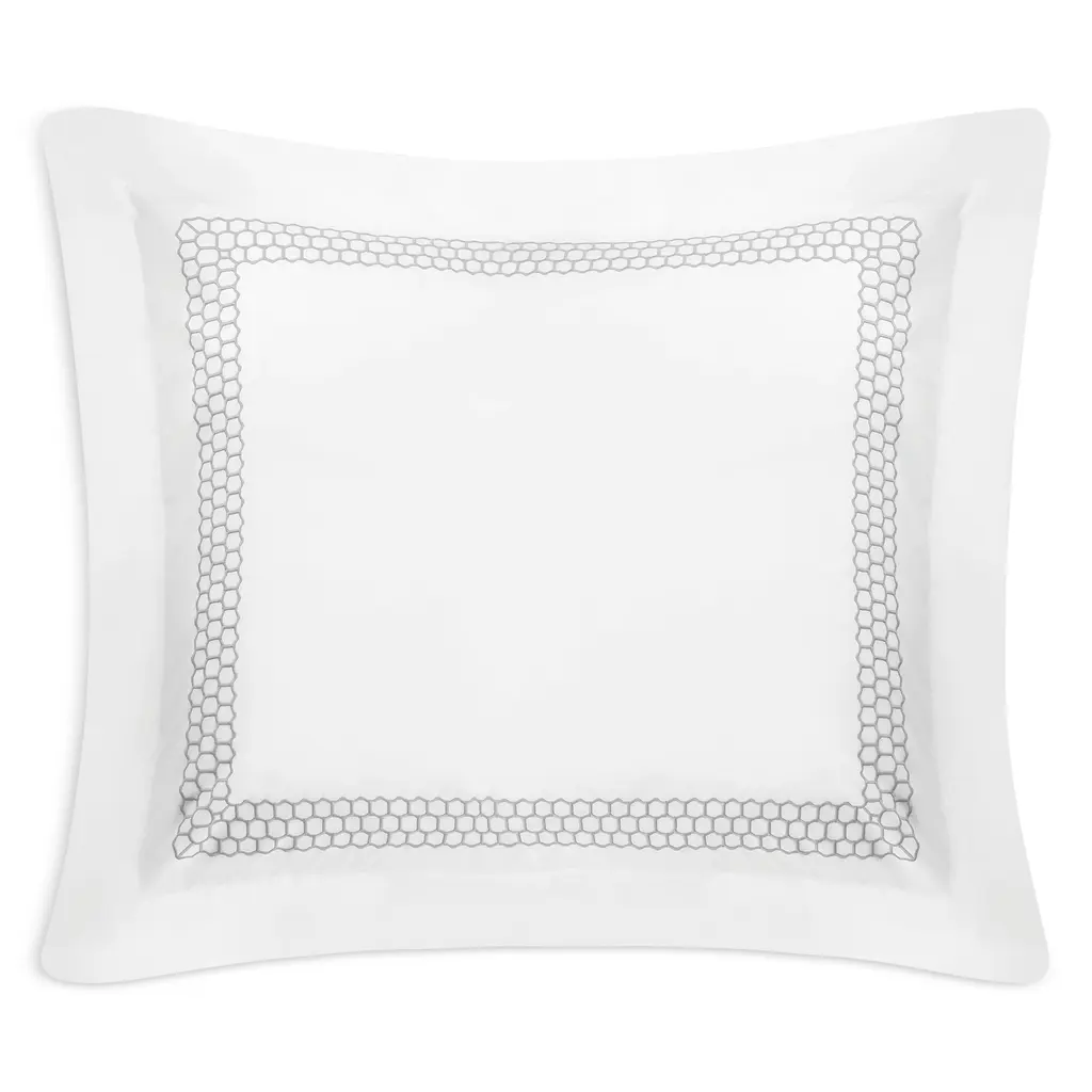 Crafted in luxurious, crisp 520-thread count cotton percale, this sham by Matouk features a frame of geometric embroidery.