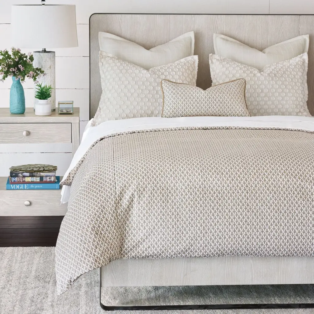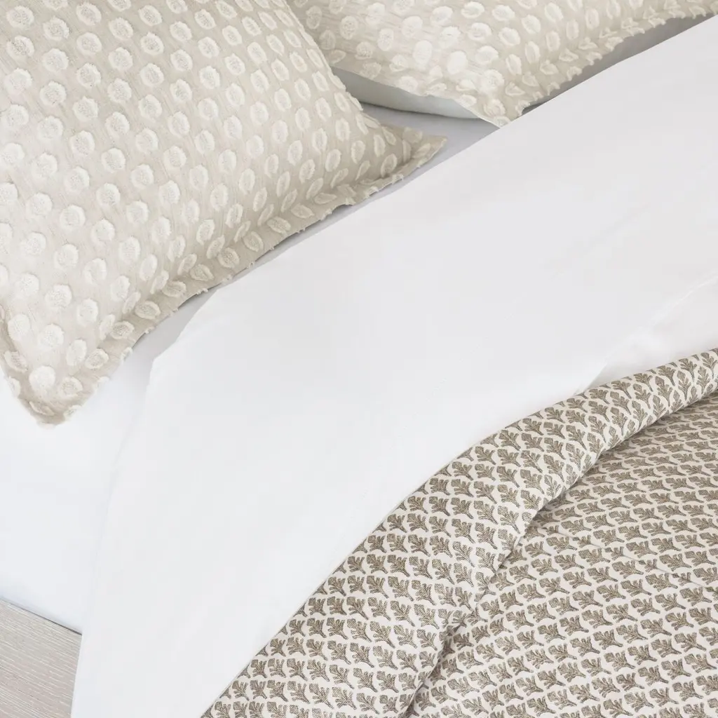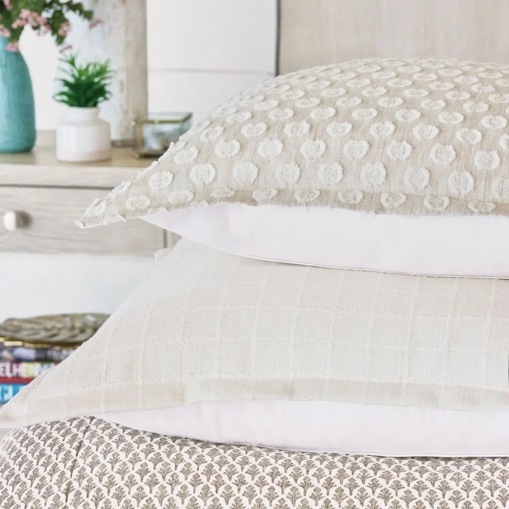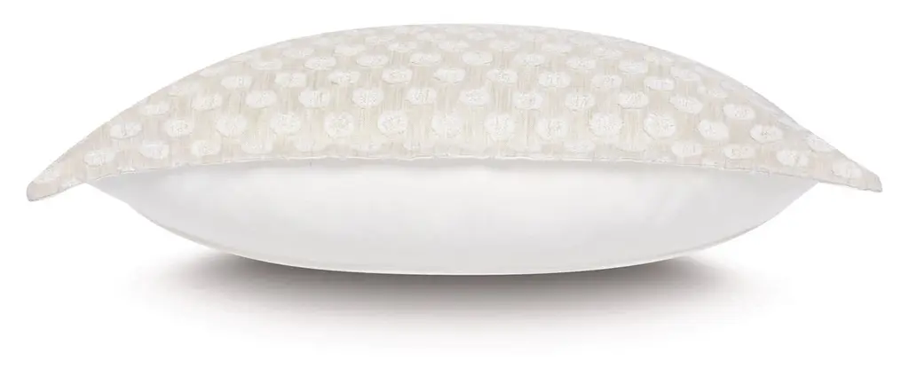 The dots adorning the front of this pillow sham look like embroidery, but they're actually fil coupé, in which select threads of a jacquard fabric are precisely cut after weaving. It's a painstaking process, but as is apparent here, the result is spectacular. The sham comes with a feather insert for optimal plushness. Solid back.