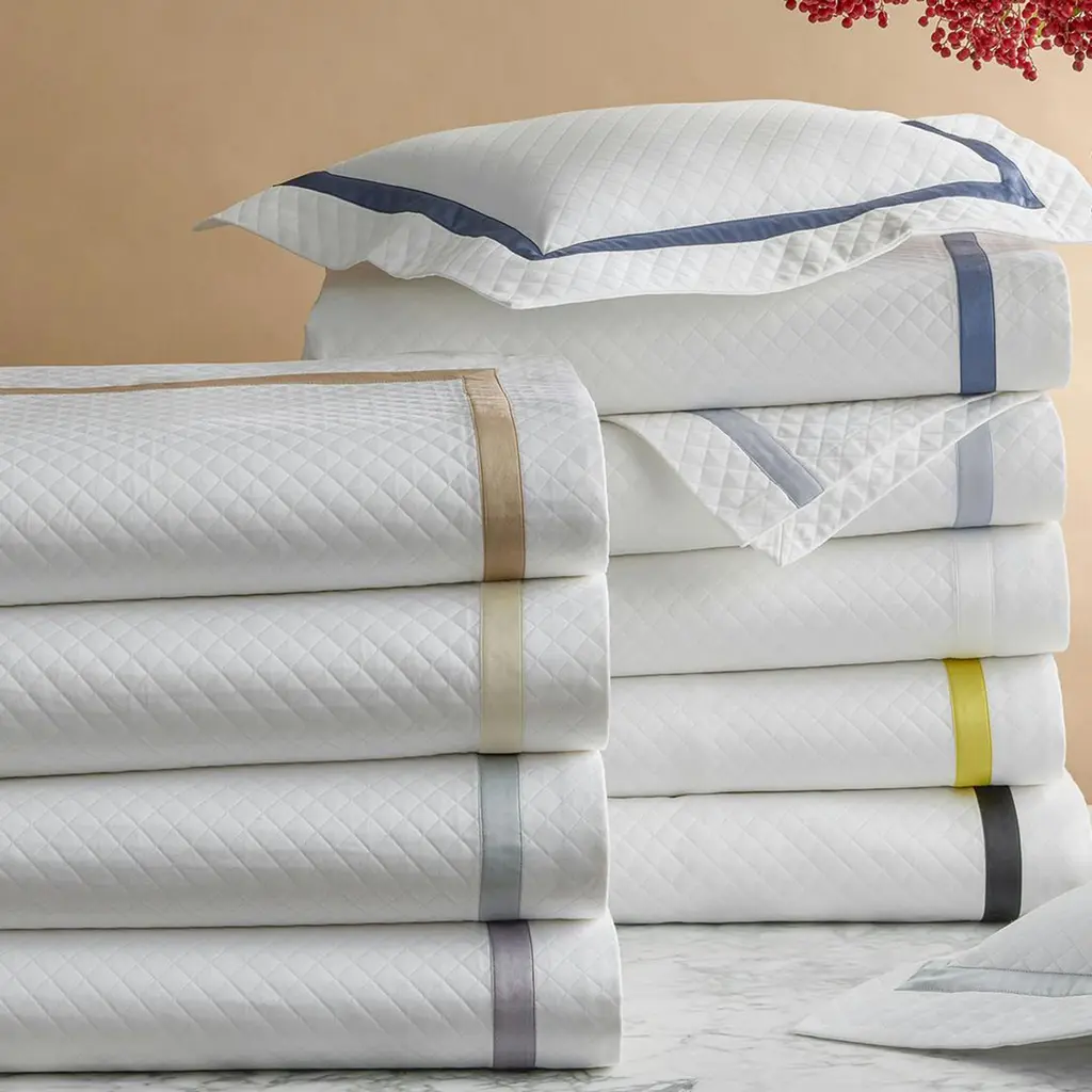 Matouk's sumptuous Petra diamond matelassé fabric is embellished with an iconic sateen tape border in the best-selling Lowell collection. With a subtle sheen and easy drape, these coverlets and shams offer an elevated finish to the bed all year round.