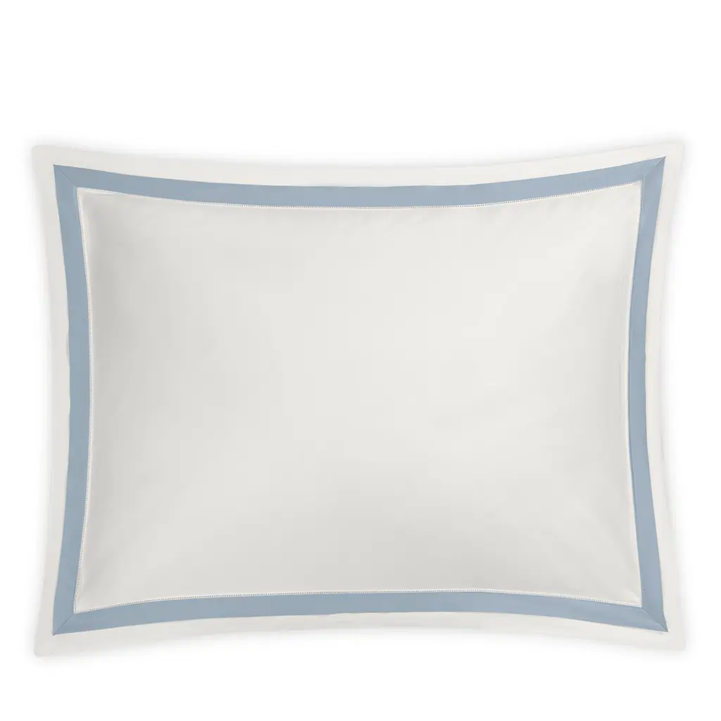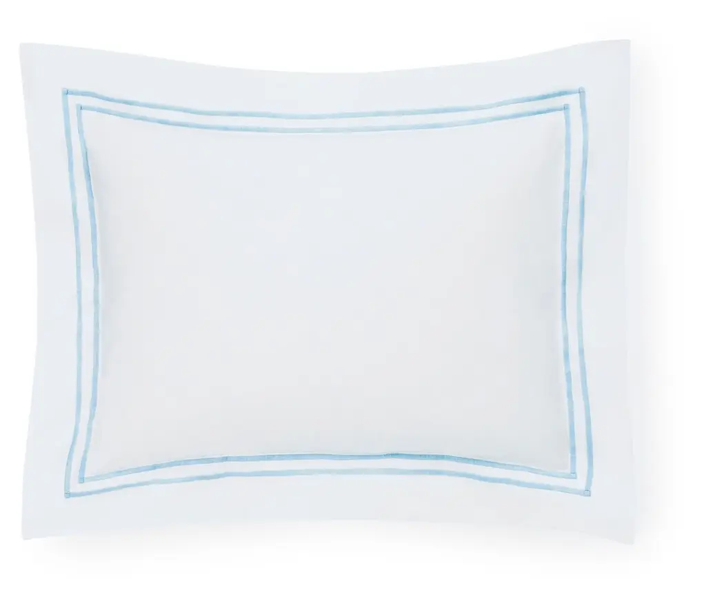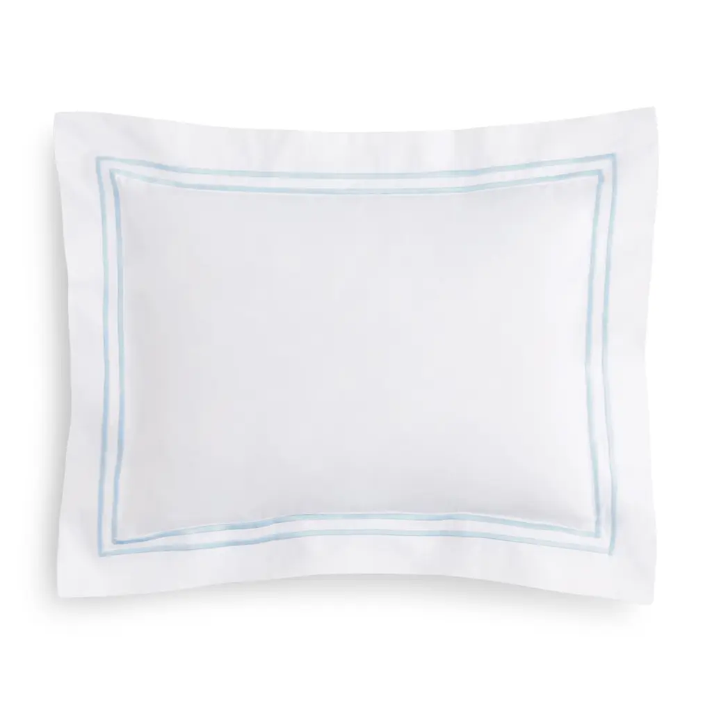 Matouk pairs fabrics of superlative quality with embroidery and couture-level detail to create luxurious bedding and linens. Matouk's rich history of old world techniques and passion for innovation infuses refinement into every collection. A classic bedding collection in crisp, white 600-thread count Egyptian cotton percale with a tape border in muted hues. A coordinating coverlet features an all over pearl matelasse design.