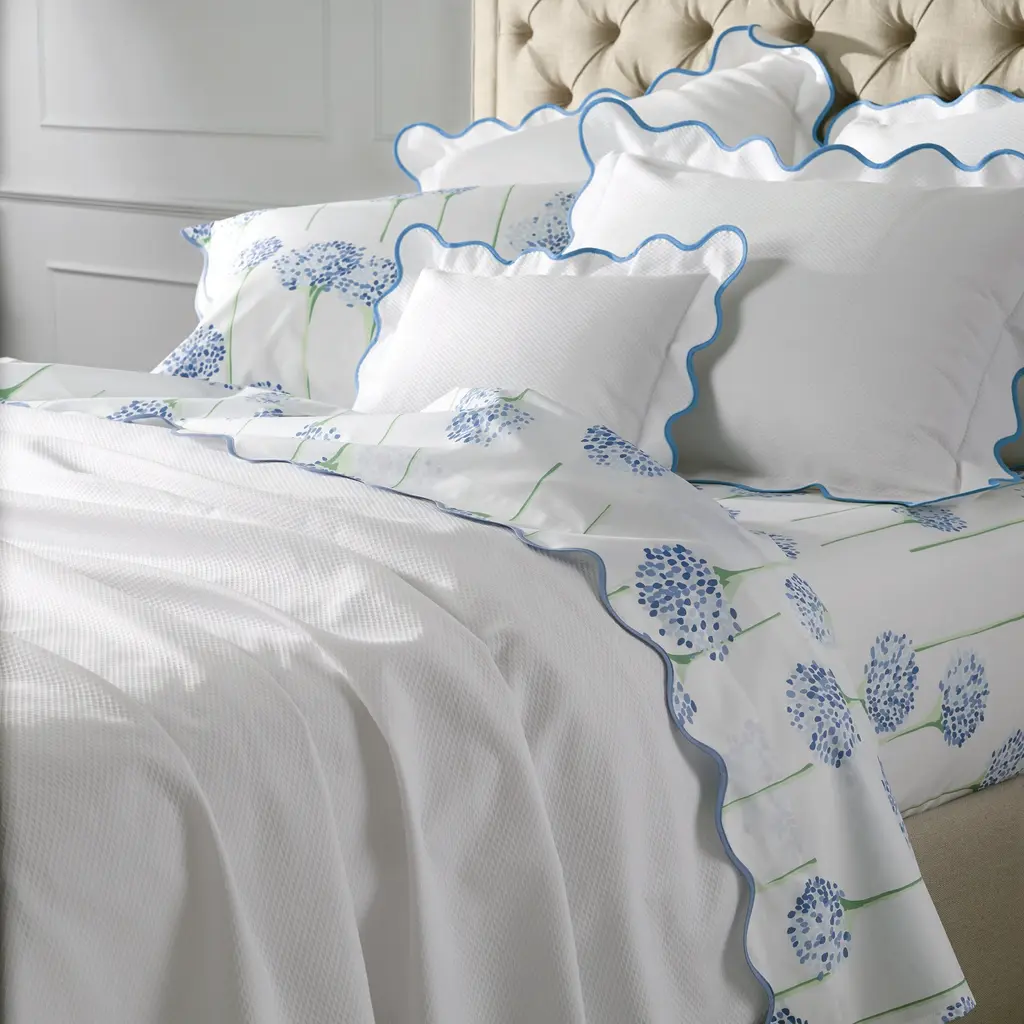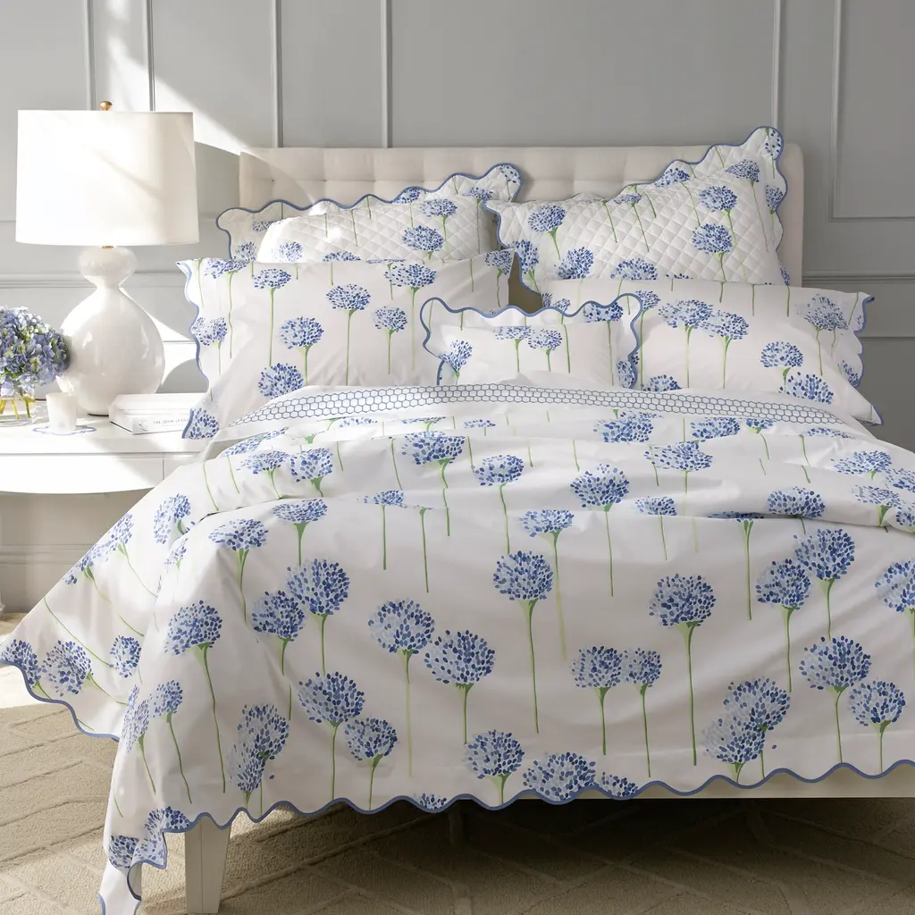 Allium flowers in soft pastel shades are dappled across the scalloped duvet and shams of this charming collection by Lulu DK for Matouk, crafted in luxurious 500-thread count Egyptian cotton percale.