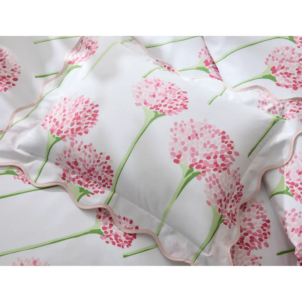 Allium flowers in soft pastel shades are dappled across the scalloped duvet and shams of this charming collection by Lulu DK for Matouk, crafted in luxurious 500-thread count Egyptian cotton percale.