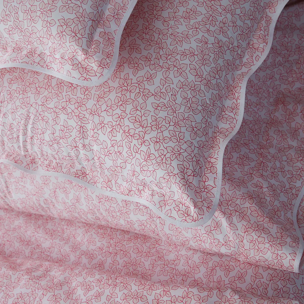 A dappled leaves print in soft, pastel hues adorn the Margot bedding collection by Matouk. Crafted in crisp, luxurious 500-thread count cotton percale, the duvet cover and shams are finished with a trimmed scallop edge.