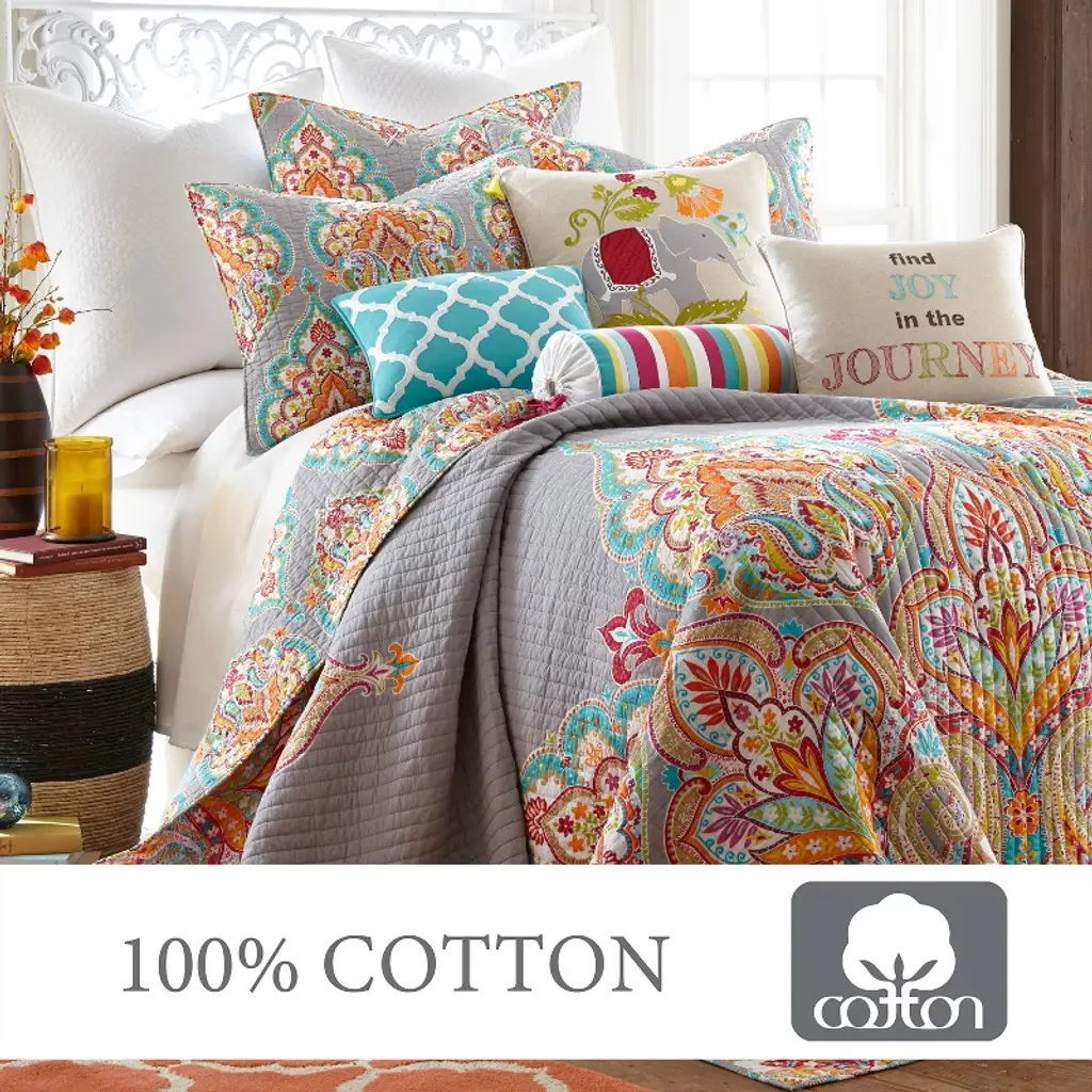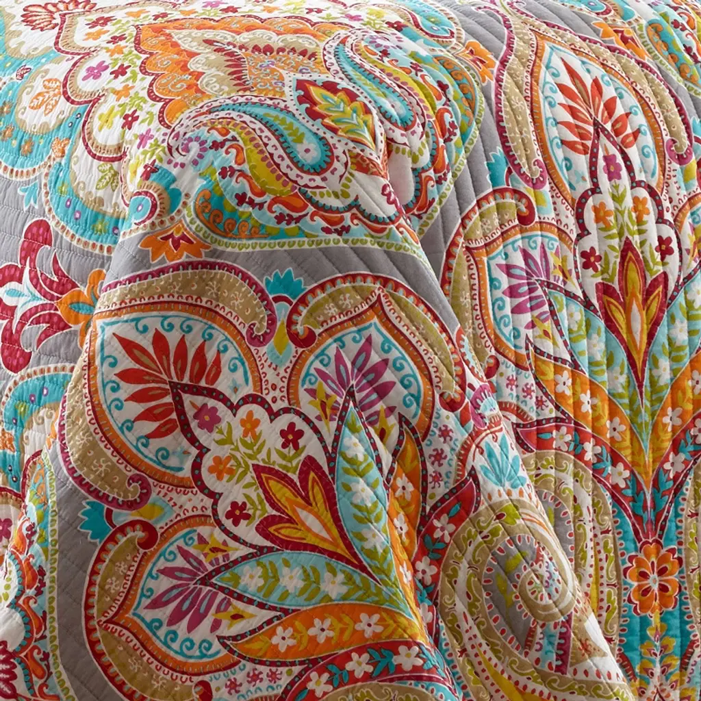Brightly-colored damasks in reds and teal on a grey ground decorate the Levtex Home Marielle Quilt Set. This machine-washable set is made from 100% pre-washed cotton. The set includes a reversible quilt, and comes with matching pillow shams. Imported.