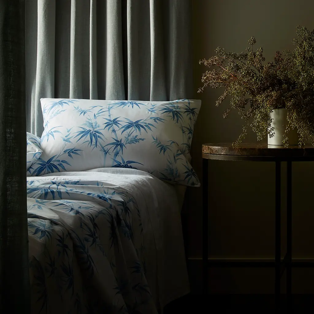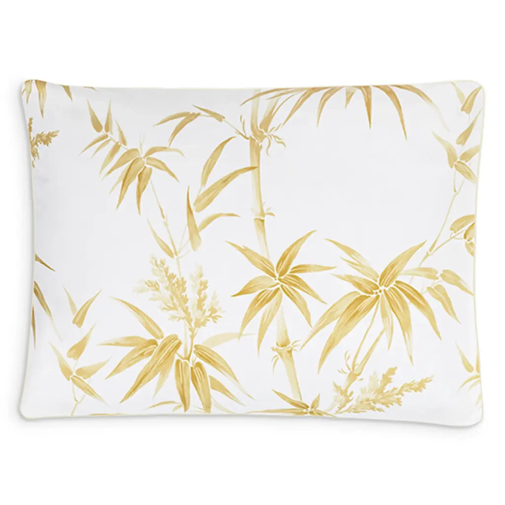 Tropical bamboos sweep across Dominique, a lively design inspired by Schumacher's Arita floral. The large-scale, airy botanicals add whimsy to any space and are printed in four earthy colors. The design is printed on our 500-thread count Luca Egyptian cotton percale and is finished with a contemporary corded edge.