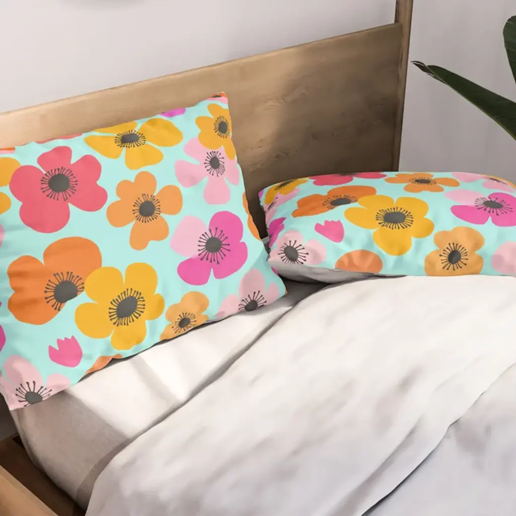 Midcentury Playful Botanical Bold Multicolor Retro Flowers Turquoise Pillow Sham