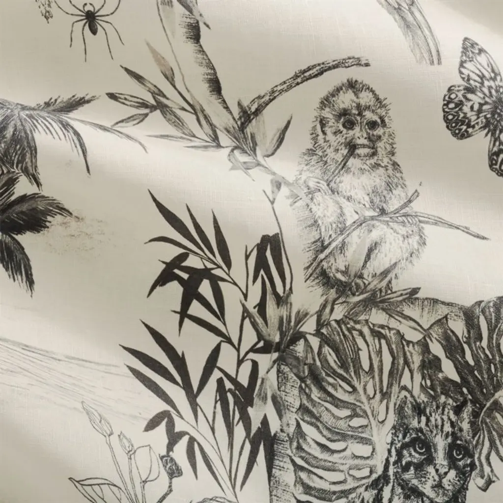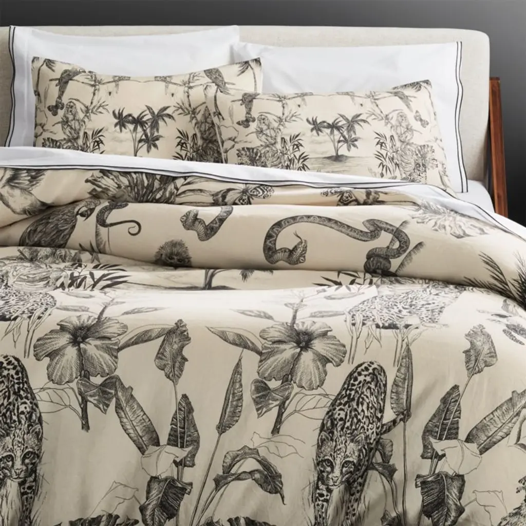 British fashion designer Matthew Williamson veers in a neutral direction with a jungle design that looks plucked from an eccentric English manor. Initially sketched by hand in the designer's studio, the monochrome collection is made of a high-quality cotton/linen blend in a soft, parchment hue, giving it a vintage-like quality. An illustrative addition to neutral and colorful spaces alike. Pillow shams are finished with an envelope closure. CB2 exclusive.