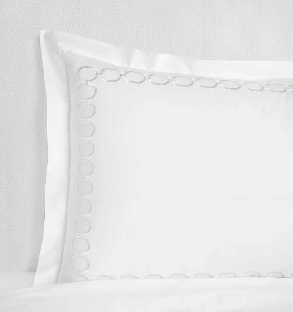 Millesimo Bedding Collection by SFERRA is polished sateen that is supple, luminous, and soft, finished with a lace inset border in a chain motif.