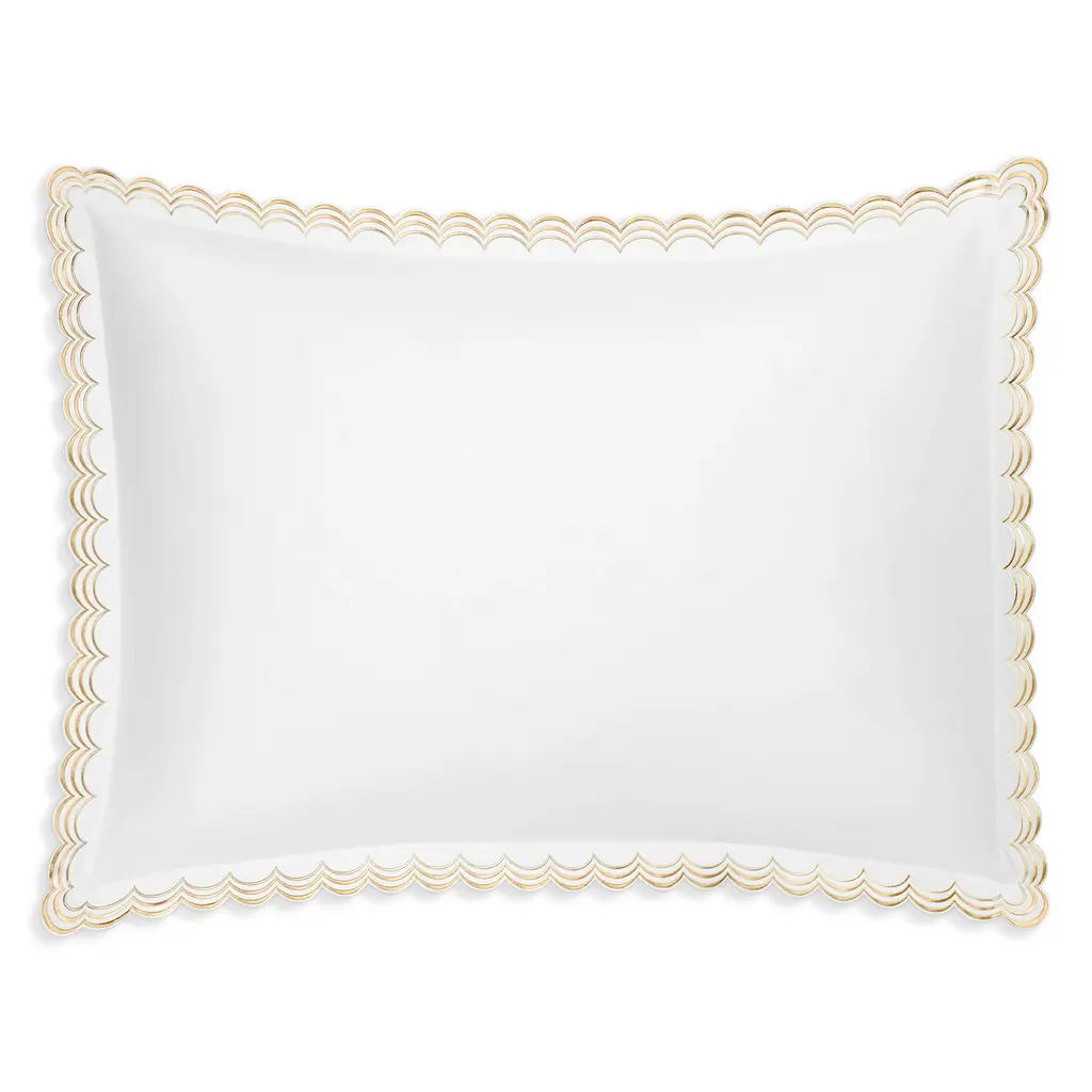 A contrasting double ribbon appliqué border trims this Matouk sham crafted in crisp white, luxurious Egyptian cotton percale, inspired by the unique arch trim of shop awnings on Worth Avenue in Palm Beach.