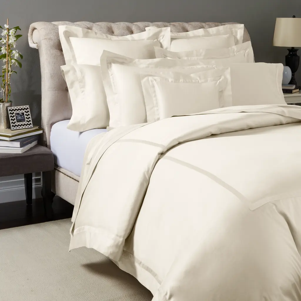 Crafted from fine Egyptian cotton, Nocturne bedding completes an opulent or traditional space, with its classic colors and luminous sheen, accented with a tonal ribbon border. Shams are accented with a tonal ribbon border.