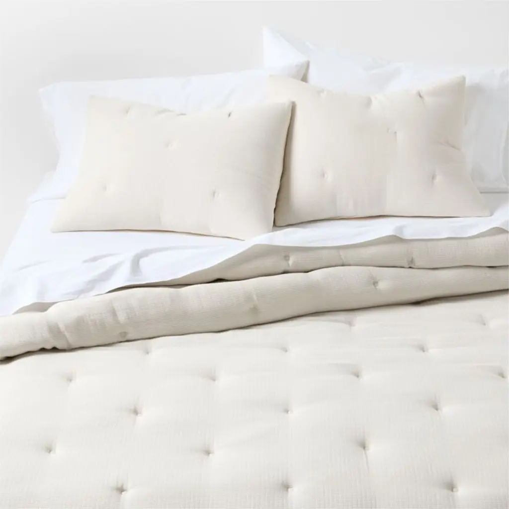 Layers of puckered gauze double up for a delicately crinkled pillow sham in dreamy, creamy taupe. Quilted by hand with four thread ties that finish the sham with the look of a treasured heirloom, the organic cotton fabric offers soft breathability and a breezy vibe. Our exclusive cotton textured pillow sham pairs with the matching comforter to make a modern bed with irresistible texture and a casual, lived-in look.Bed pillows also available.