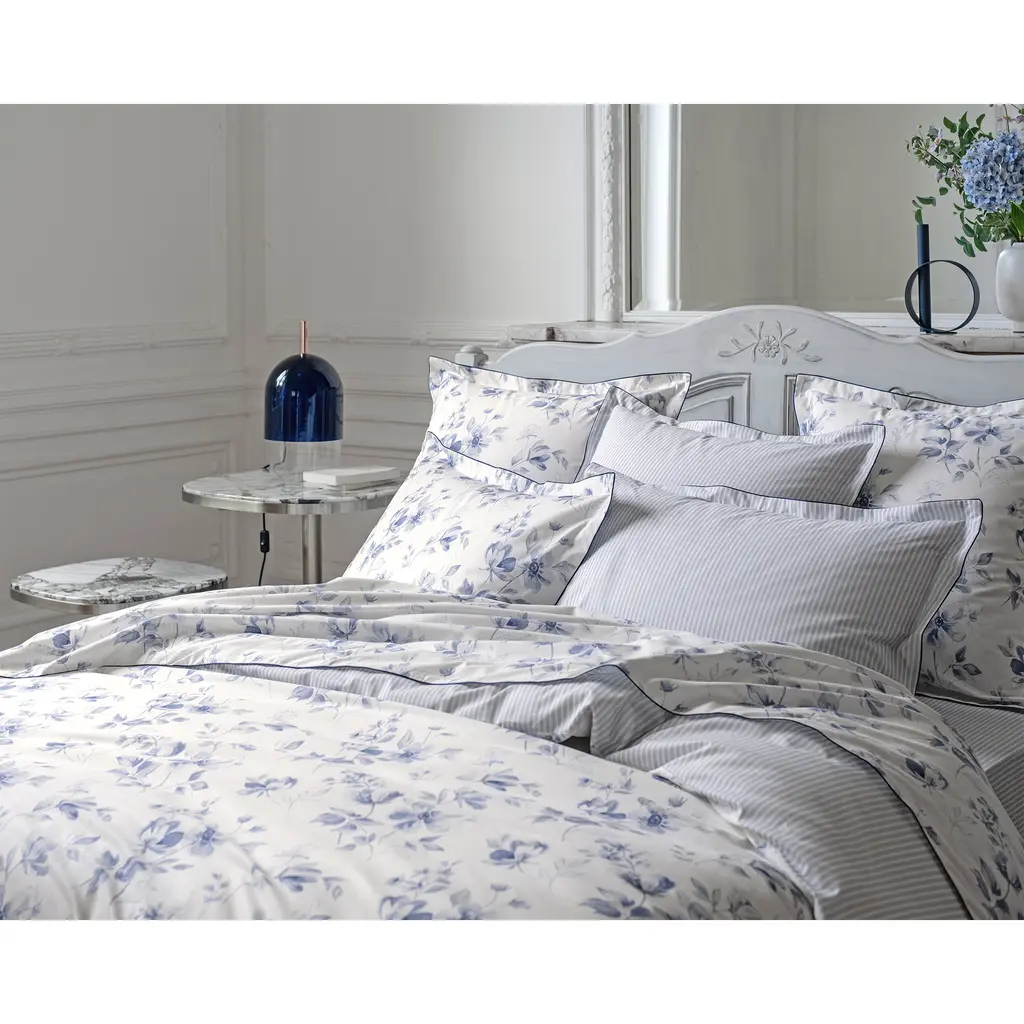Passé Présent, meaning Past Present in English, offers a modern take on classic blue-on-white styling with flowers coordinated with a fine gauge stripe. Inspired by the French Riviera.
