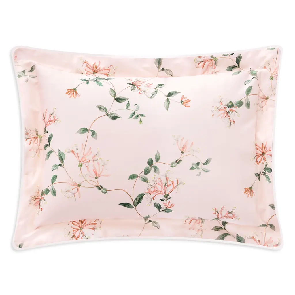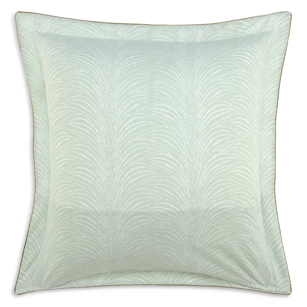 The Pollen Bedding Collection by Yves Delorme displays hazel tree blossoms that imprint their pollen in delicate rhythms on cotton batiste.