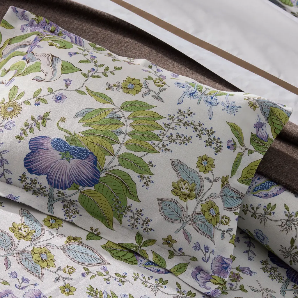 Alive with vivid florals and lush foliage, the Schumacher Pomegranate design that appears on one of Matouk's most popular percale styles is reimagined in signature Roman linen. The bedding collection is beautifully soft to the touch, with linen's rich texture adding new dimension to the archive print.