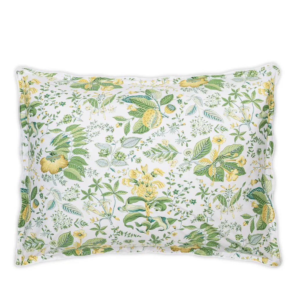 A vibrant expression of artistry and craftsmanship, this exquisite Pomegranate collection of Matouk bedding features an 18th-century botanical print from Schumacher's archive.