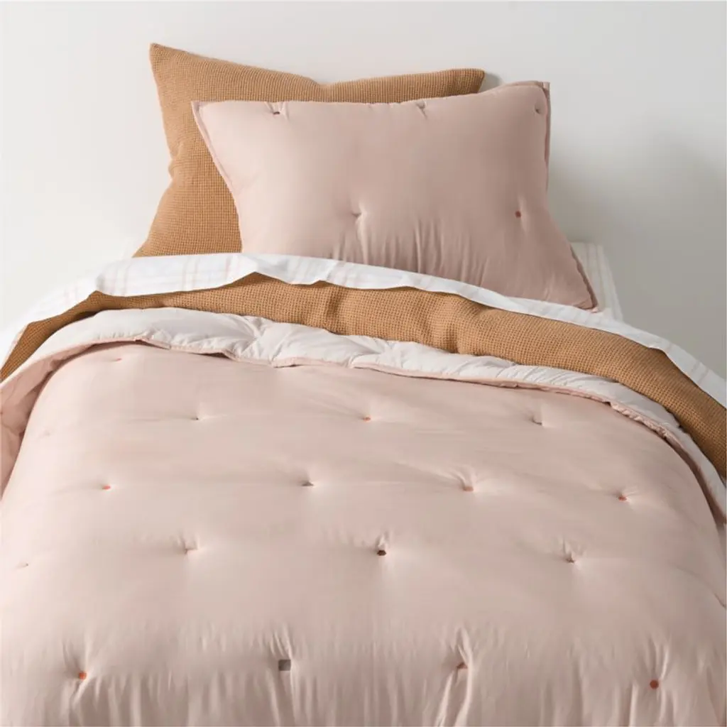 Stitched geometric shapes in bright pops of color give our pillow sham a sophisticated yet playful look. Embroidered in warm hues of savannah yellow, terracotta, classic mauve and almond brown, the all-over pattern pops against the elegant pink background, which reverses to a solid natural blush. The sham is made of airy and lightweight organic cotton voile, designed to feel as comfy and cozy as your kid's favorite puffy jacket. Pair the sham with the matching comforter or any of the coordinating colors from our kids' bedding collections.