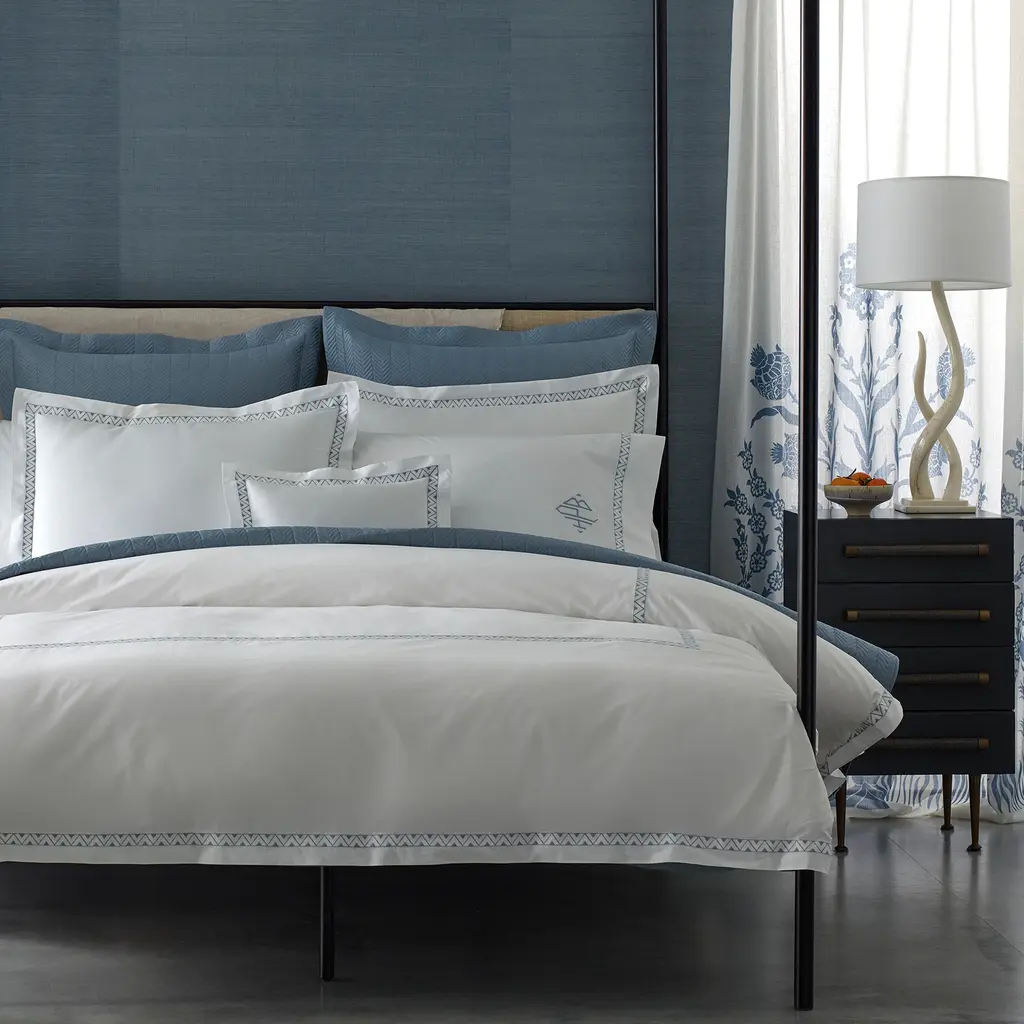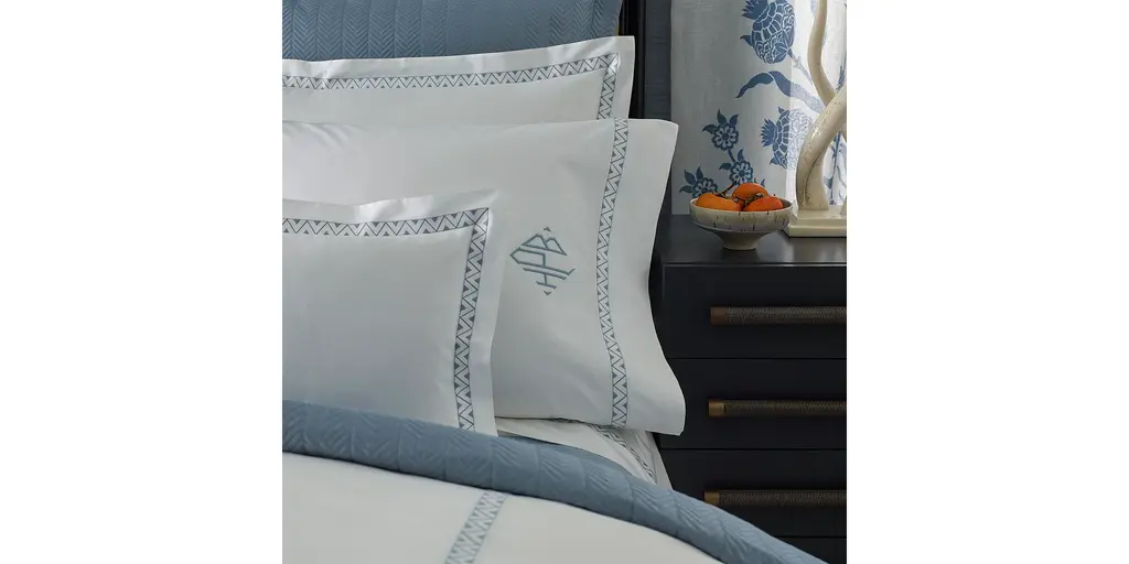 Prado creatively combines a chic Schumacher design and a classic Matouk construction, with breathtaking results. The finished product has a crisp, tailored look with a delicious pop of colorful decoration.
