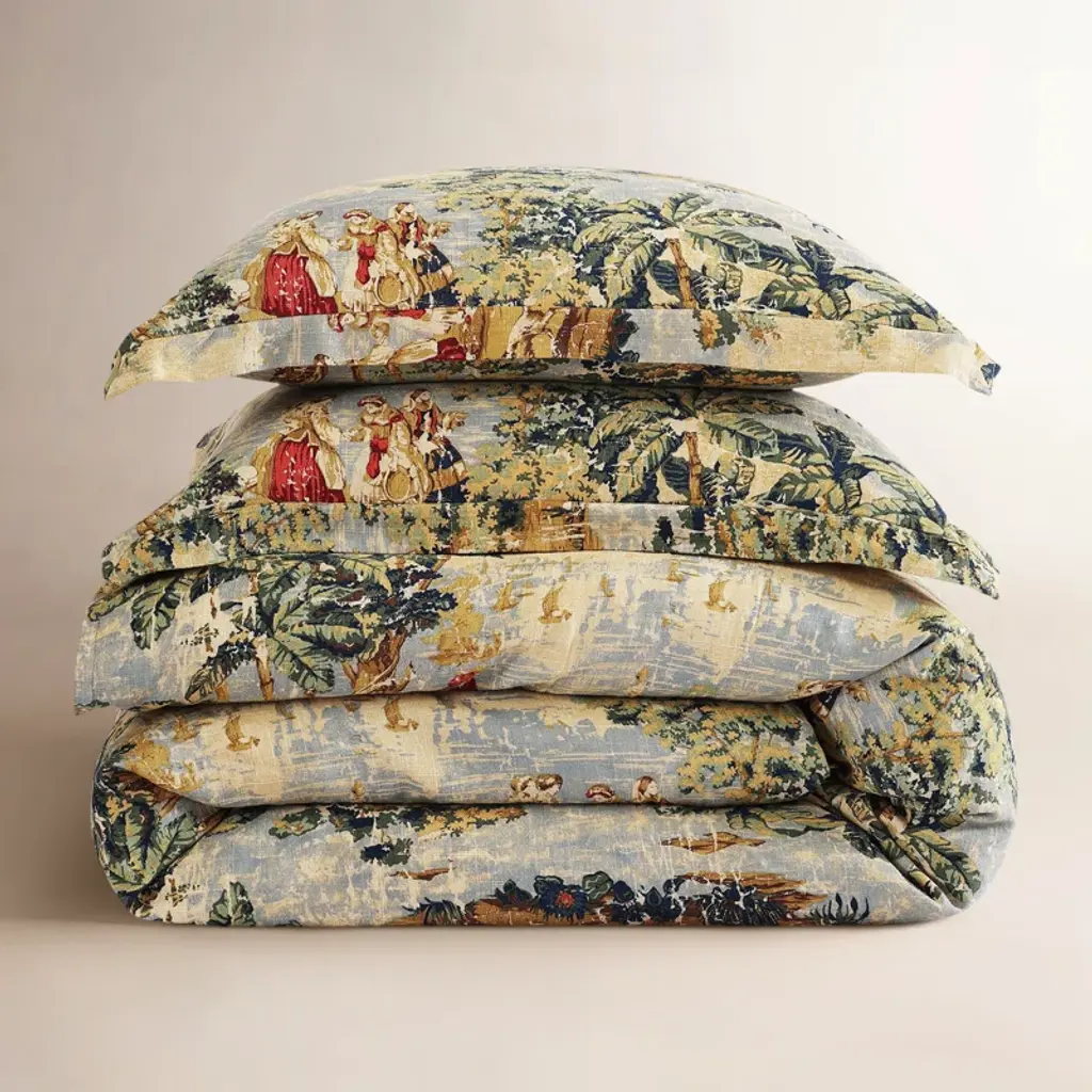 Step back in time with our Provence Washed Linen Bedding Set, a vintage revival with a modern twist. Inspired by the colorful toile patterns of the 1980s, this shabby elegance comforter set features a painterly print of Victorian settlers strolling through a lush nature scene. Its soothing, golden color palette harmonizes beautifully with warm neutrals. Printed on a washed linen blend, this vintage comforter set offers a soft linen-like feel with a relaxed drape. Thanks to the fabric’s natural durability and wrinkle resistance, it allows for low-maintenance care while still retaining its quality. Ideal for year-round use, it layers wonderfully with solid-colored pieces from our Stella Collection.