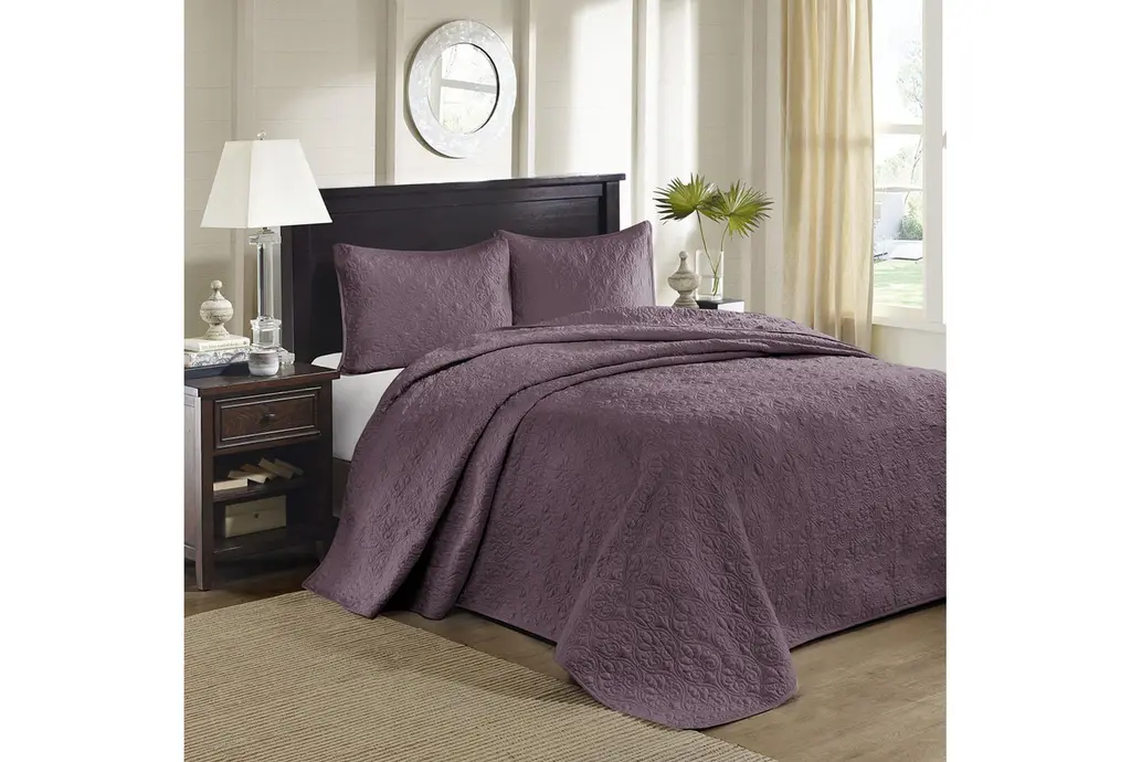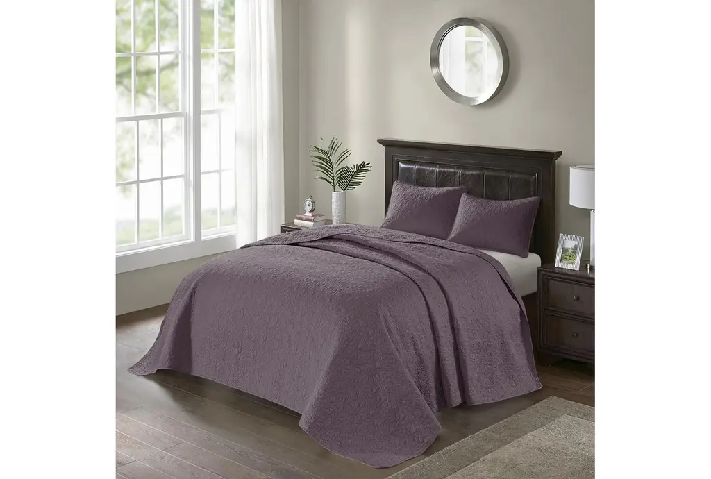 Queen Bedspread- Purple Quebec Reversible Polyester 3 Piece Set With 1 Bedspread & 2 Standard Shams | Machine Washable