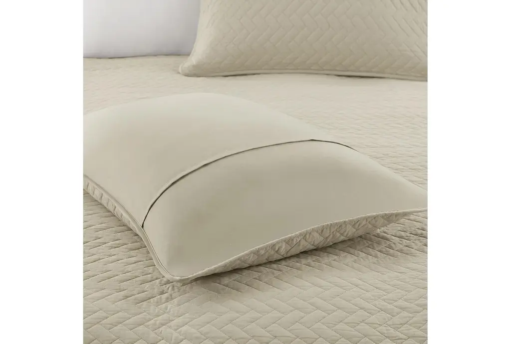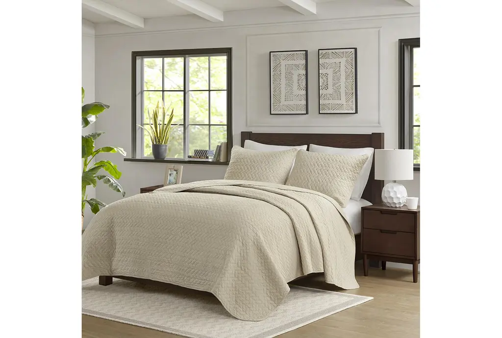 Enhance your bedroom with the Queen Quilt-Linen Velvet Touch Polyester 3 Piece Set. This casual and cozy quilt set features a soft linen color, adding a neutral and calming vibe to your space. Made from 100% polyester micro cell fabric, the set includes one quilt and two standard shams, offering comfort and style for a restful night's sleep. The quilted design provides an extra layer of warmth and texture.